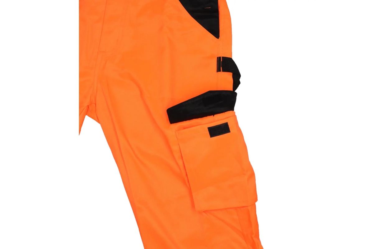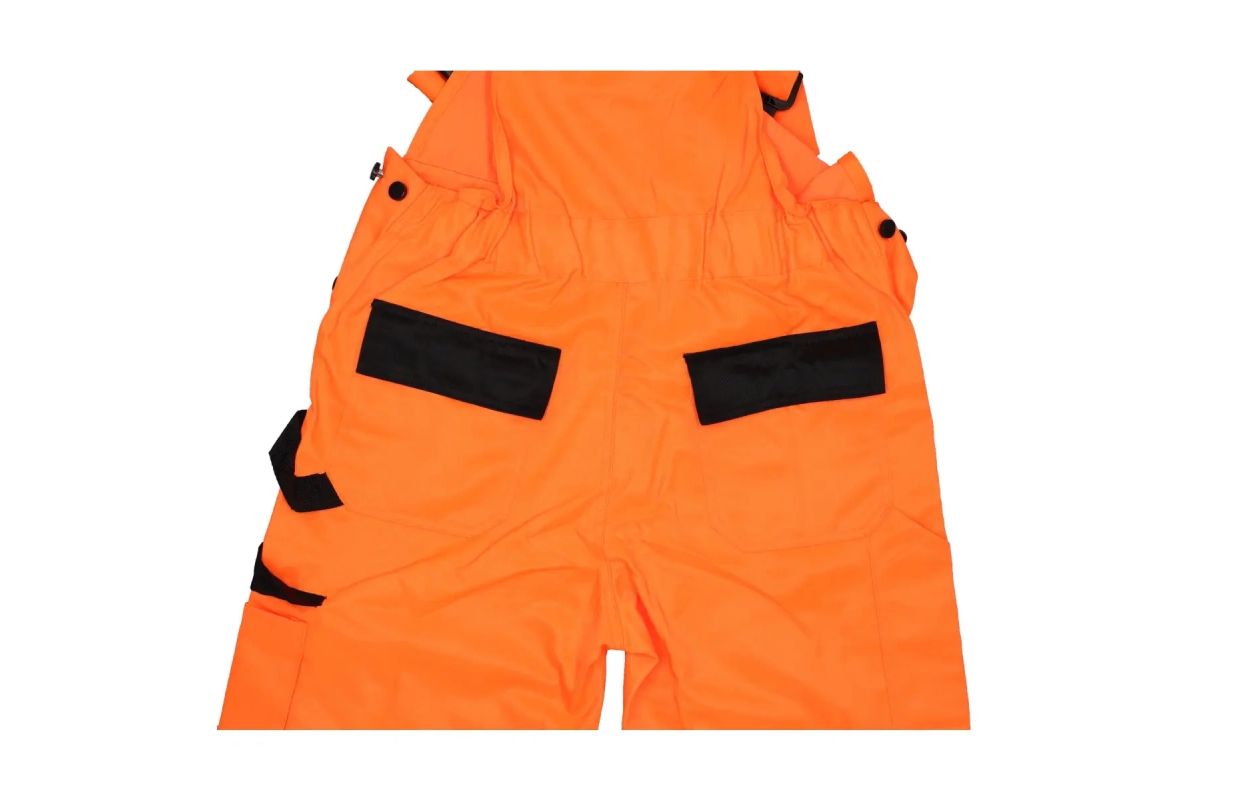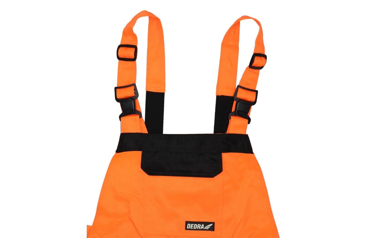 The gardening trousers are made from a poly/cotton blend of 250 g/m². The trousers have an elastic waistband and adjustable braces with sewn-in elastic bands. The trousers have 8 practical and functional pockets and a belt loop for a hammer. Reflective tapes on the legs and additionally on the waistband. Sizes available from S to 2XL. Orangecolour.