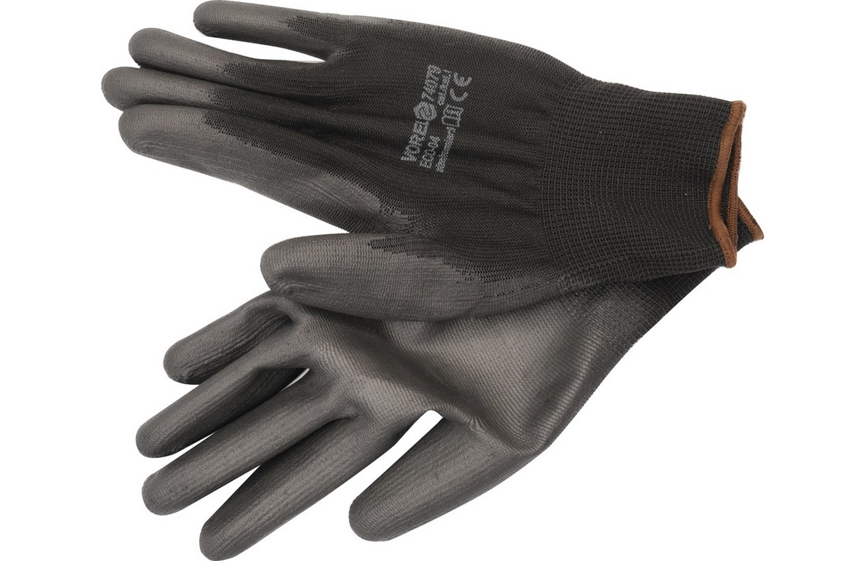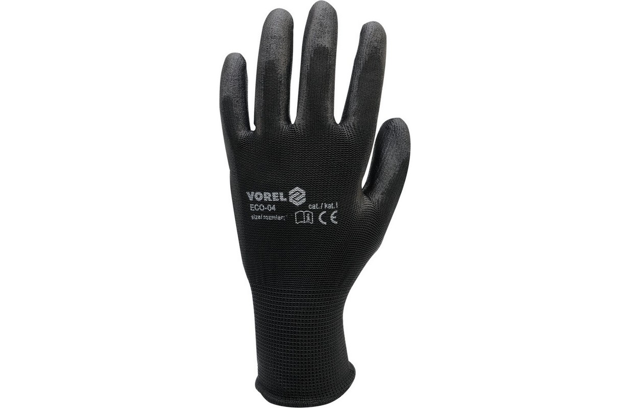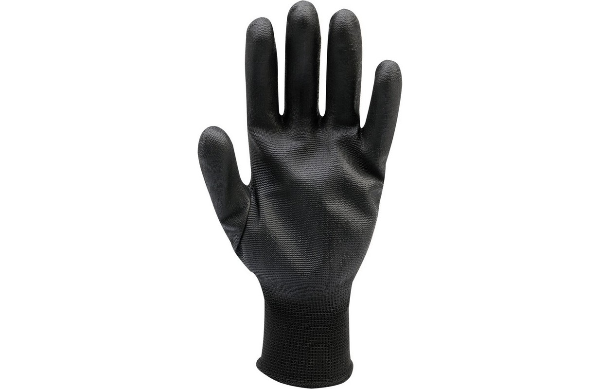 Work gloves made of black polyester, coated with black polyurethane in the grip area. Seamless construction provides high comfort and excellent feel for the object being held.