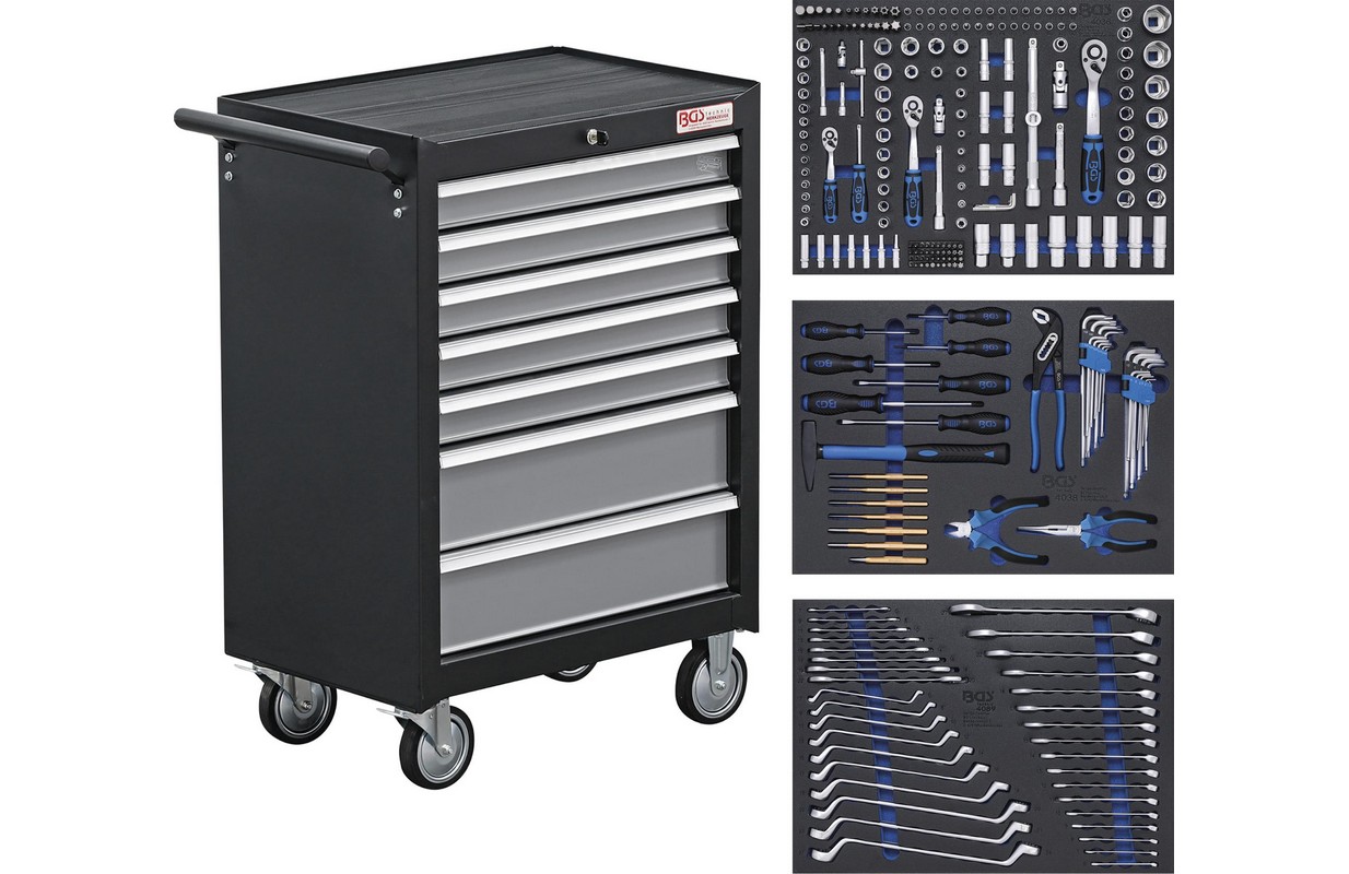 Description consisting of workshop trolley BGS 2001 incl. 3 tool trays, 3/3 made from high-resistance foam (dimensions 567 x 408 x 32 mm) Hexagon Socket Set, reversible ratchets | 192 pcs. (BGS 4036) Hammer, Pliers, Screwdriver Set | 36 pcs. (BGS 4038) Double End Spanner-, Double Ring Spanner-, Combination Spanner Set | 35 pcs. (BGS 4089)