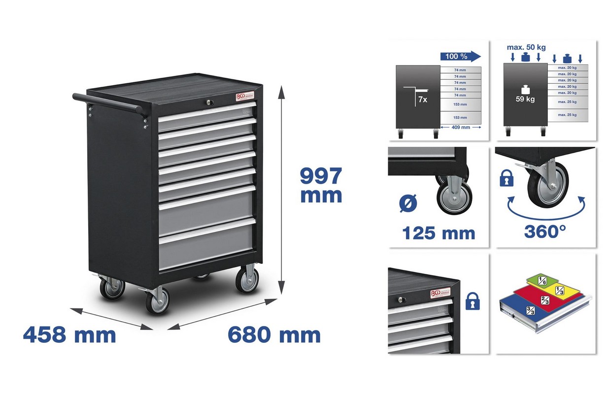 Technical data Number of Drawers 7 Piece(s) Drawer pull-out 100 % Height 1000 mm Width 680 mm Depth 458 mm Drawer width 569 mm Drawer depth 409 mm Drawer height 5 x 52 | 2 x 130 mm Gross weight 83630 g Material Chrome Vanadium Steel