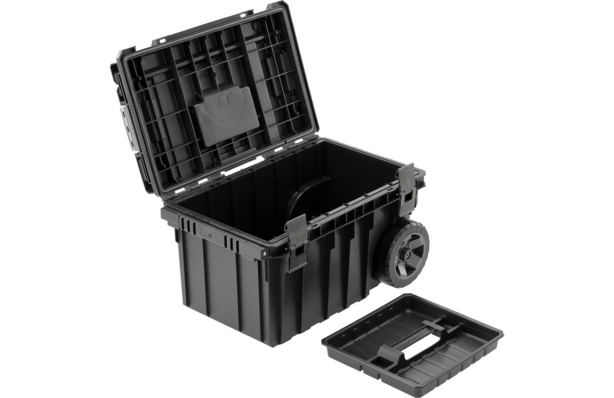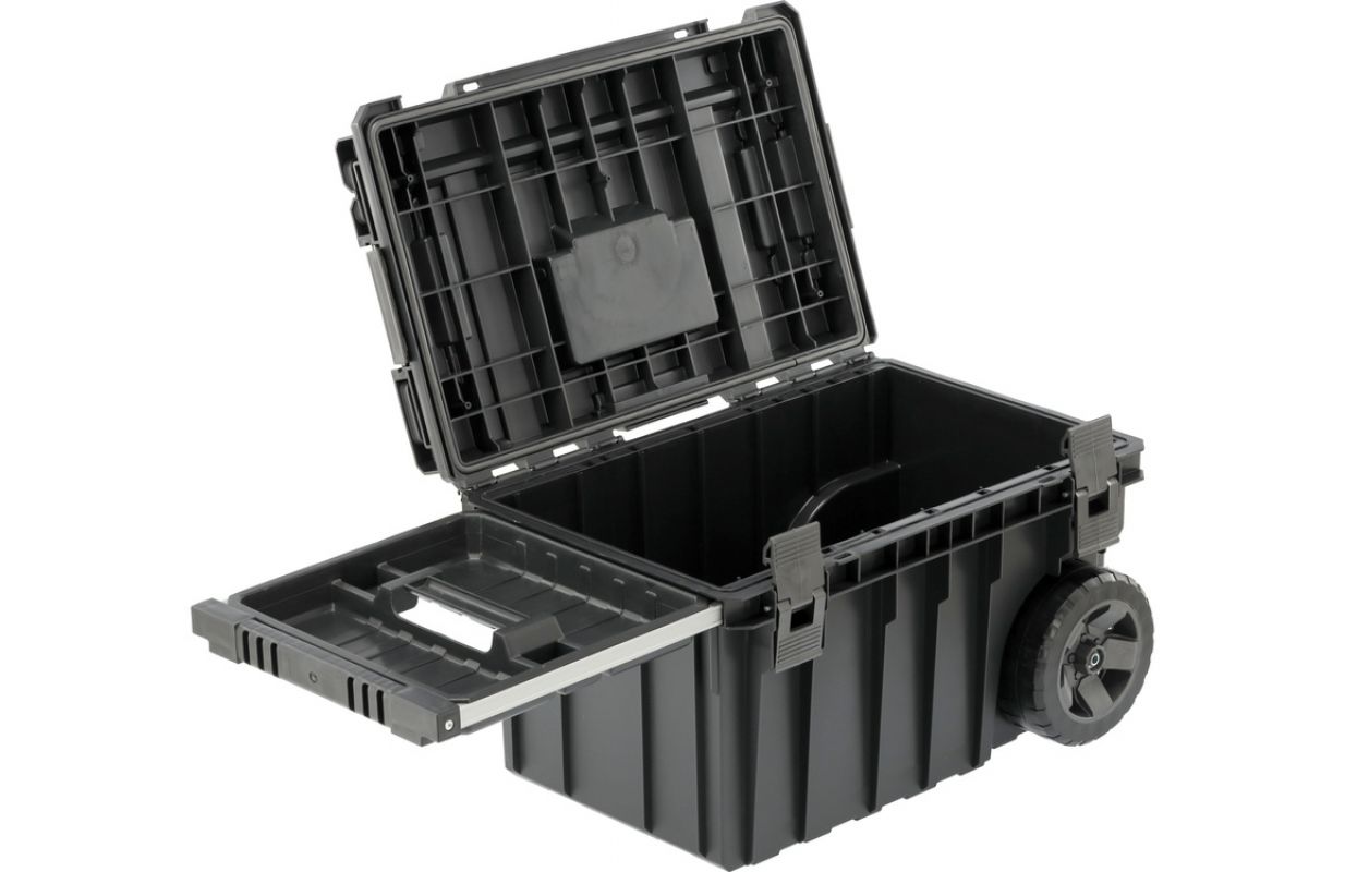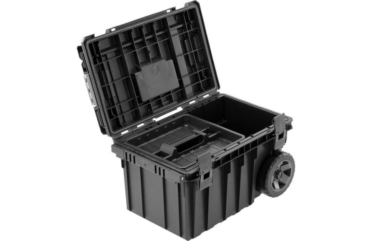 Large toolbox on wheels. Fitted with a tool tray with a large surface area and shallow depth, leaving plenty of packing space. Two overrun wheels mounted on a metal axle allow the safe transport of box sets and organisers. A telescopic aluminium handle extending from the side facilitates comfortable access to the inside of the box. The box is fitted with a flexible seal to provide protection against dust and water ingress. Connectors on the lid allow connection to other models of the S1 and S12 system. An extendable frame with a simple locking mechanism guarantees stable forward and reverse guidance. The protruding handle is also a stable place to put the inner tray.