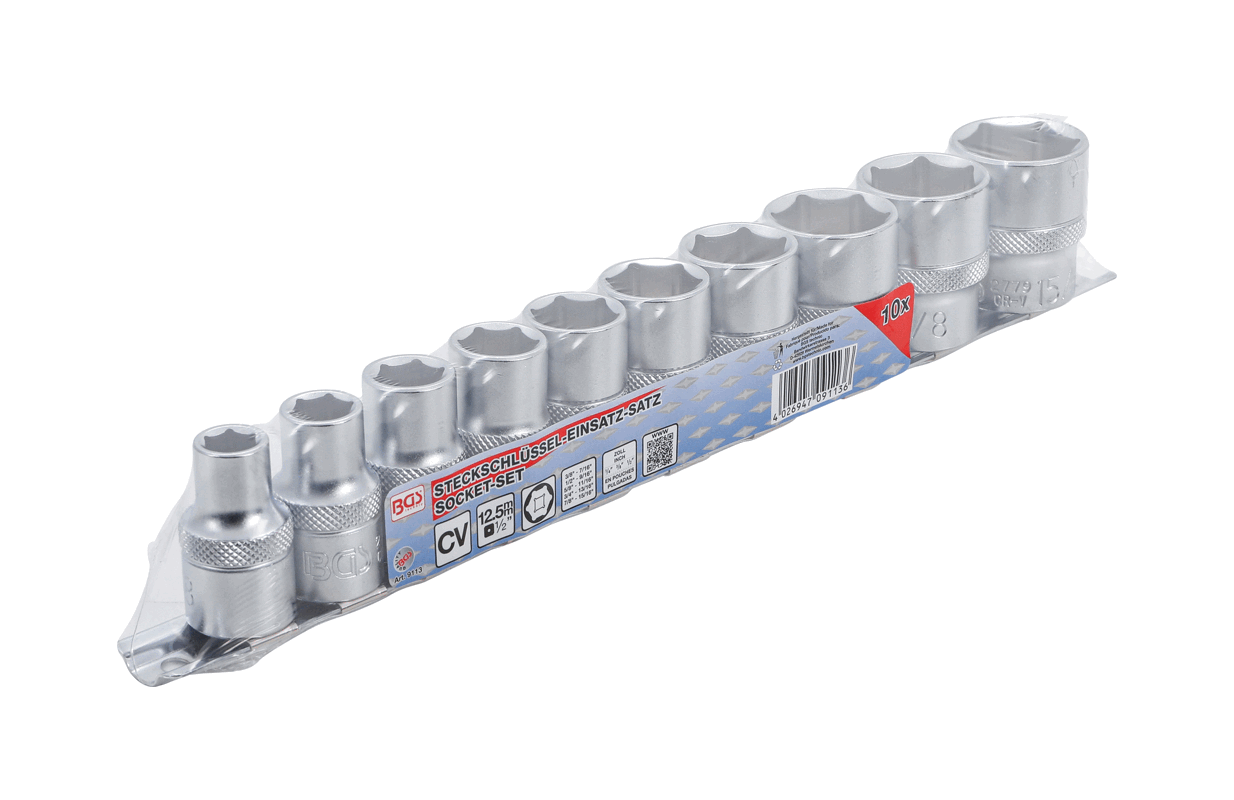 • Socket set, 12.5 mm (1/2“) drive, hexagon: 3/8" - 7/16" - 1/2" - 9/16" - 5/8" - 11/16" - 3/4" - 13/16" - 7/8" - 15/16"
