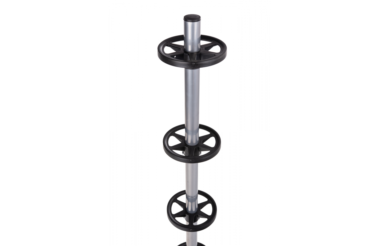 Dimensijas: Optimālie statīva izmēri (46x46x116cm) nodrošina pietiekamu vietu riteņu uzglabāšanai, vienlaikus aizņemot minimālu vietu garāžā vai darbnīcā.
