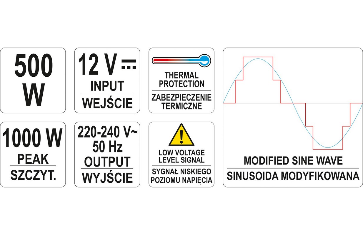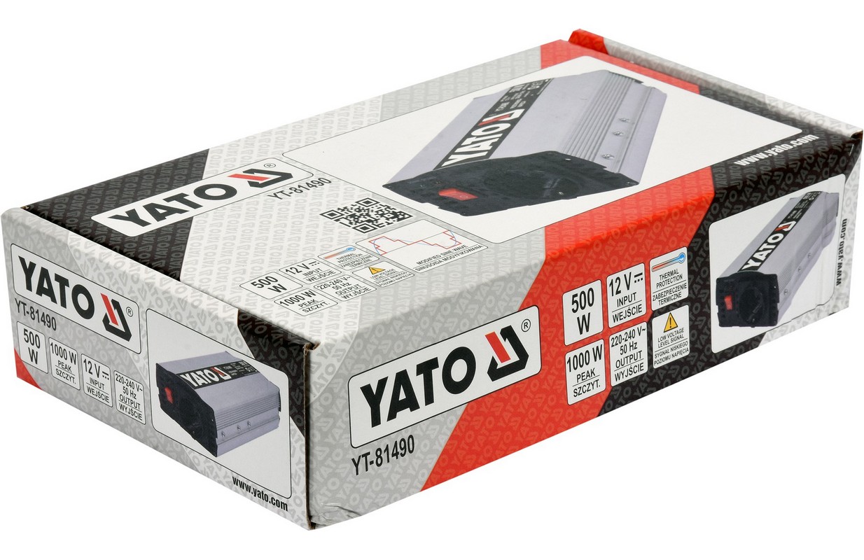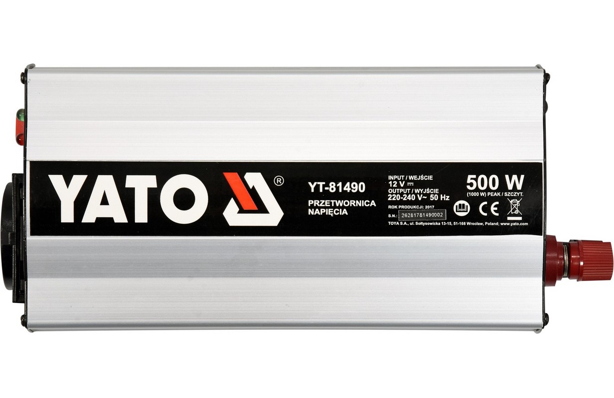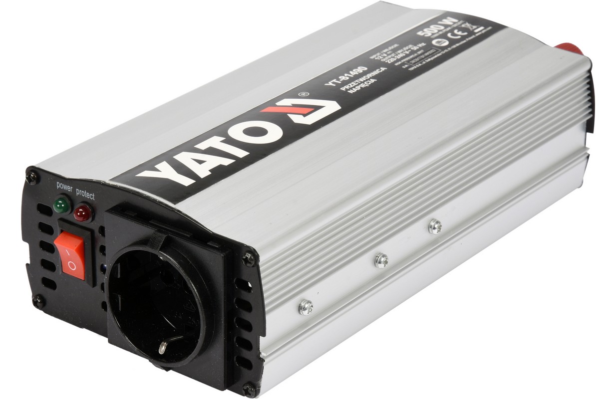 Sprieguma pārveidotājs YT-81490 12V /230V-240V 500W ir paredzēts, lai darbinātu elektroierīces, kurām nepieciešams mainīgs spriegums 230V no baterijām un automobiļu iekārtām ar nemainīgu spriegumu 12V. Invertori ir ideāli piemēroti vietām, kur nav iespējams tieši pieslēgties elektrotīklam.