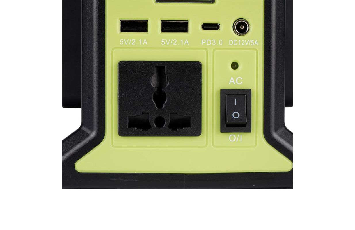 Izejas jauda: 300w Maksimālā izejas jauda: 500w Ieejas spriegums: 18V Izejas spriegums: 110/220V (pēc izvēles) Cita izeja: 2*USB (5V,3A)/Type-C(PD3.0) Lampa: 2 pakāpienu (600/1200lūmeni) Izejas viļņa forma: sinusoidālais vilnis Frekvence: 50Hz Aizsardzība pret pārslodzi: Jā Izejas īsslēguma aizsardzība: Jā Izejas sprieguma stabilitāte: Jā Izejas savienotājs: Starptautiskā universālā kontaktligzda