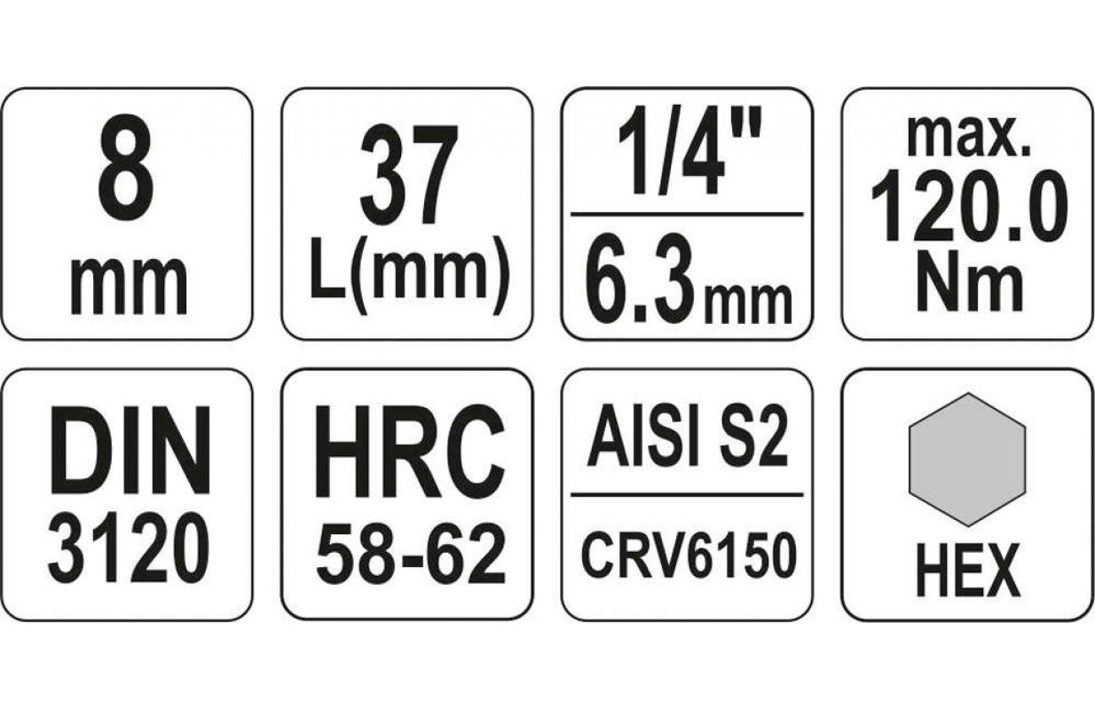 Profesionāla HEX uzgriežņu atslēga HEX, kontaktligzdas izmērs 1/4", vārpstas izmērs 8 mm. Hroma ligzda izgatavota no CrV6150 tērauda, tapa izgatavota no AISI S2 tērauda, pārklāta ar niķeļa slāni. Neaizstājams instruments automobiļu vai mehāniskajā darbnīcā.