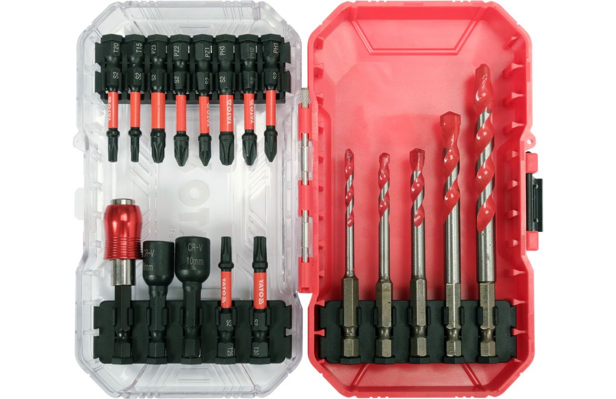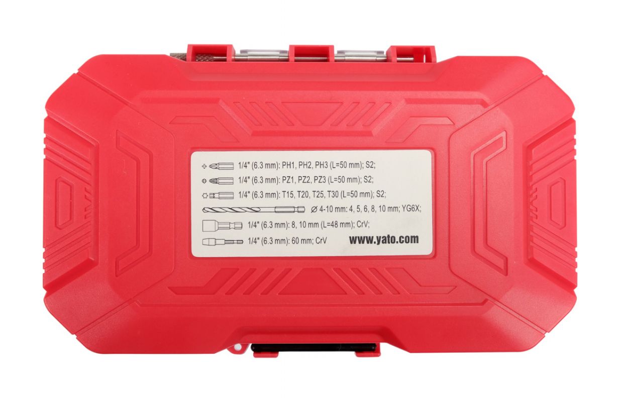 • 10 biti 50 mm: Pozidriv: PZ1, PZ2, PZ3, Torx: T15, T20, T25, T30, Phillips: PH1, PH2, PH3), izgatavoti no skābes izturīga tērauda AISI S2
