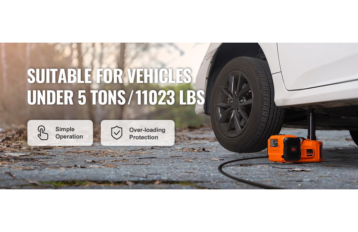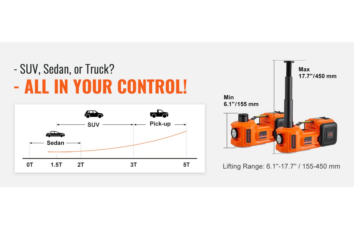 Jaudīga elektriskā domkrats 12V: Kravnesība: 5,0 tonnas. Pacelšanas diapazons: 155–450 mm. Šis elektriskā transportlīdzekļa domkrata komplekts būs glābiņš ārkārtas situācijās uz ceļiem, un to var izmantot garāžas remontam mājās. Tas ir piemērots visām automašīnām, sedaniem, SUV, kravas automašīnām un citiem transportlīdzekļiem. kas atbilst tās iespējām.