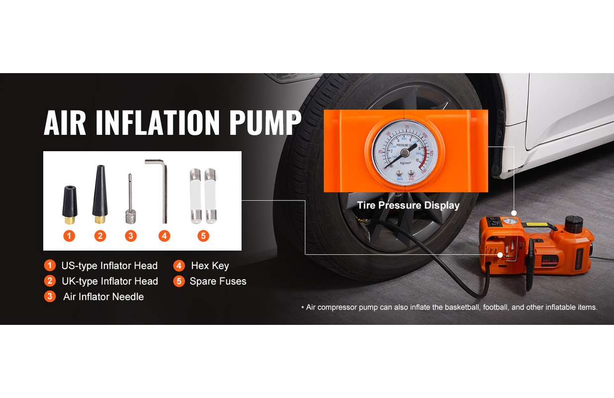 Ātrais riepu piesūcējs: Ja riepu piepūšanas sūknis ir uzstādīts automašīnas elektriskajā hidrauliskajā domkratā, jums nebūs jāuztraucas par ārkārtas situāciju, kad nekurienes vidū saplīst riepa. Slēptās instrumentu kastes abās pusēs ļauj viegli sakārtot piepūšamo urīnpūsli un piepūšamās adatas ātrai riepu piepūšanai. Riepu spiediena displejs ir aprīkots ar riepu spiediena displeju, kas ļauj uzraudzīt riepu spiedienu, veicot spiedienu. Jūsu automašīna saka paldies!