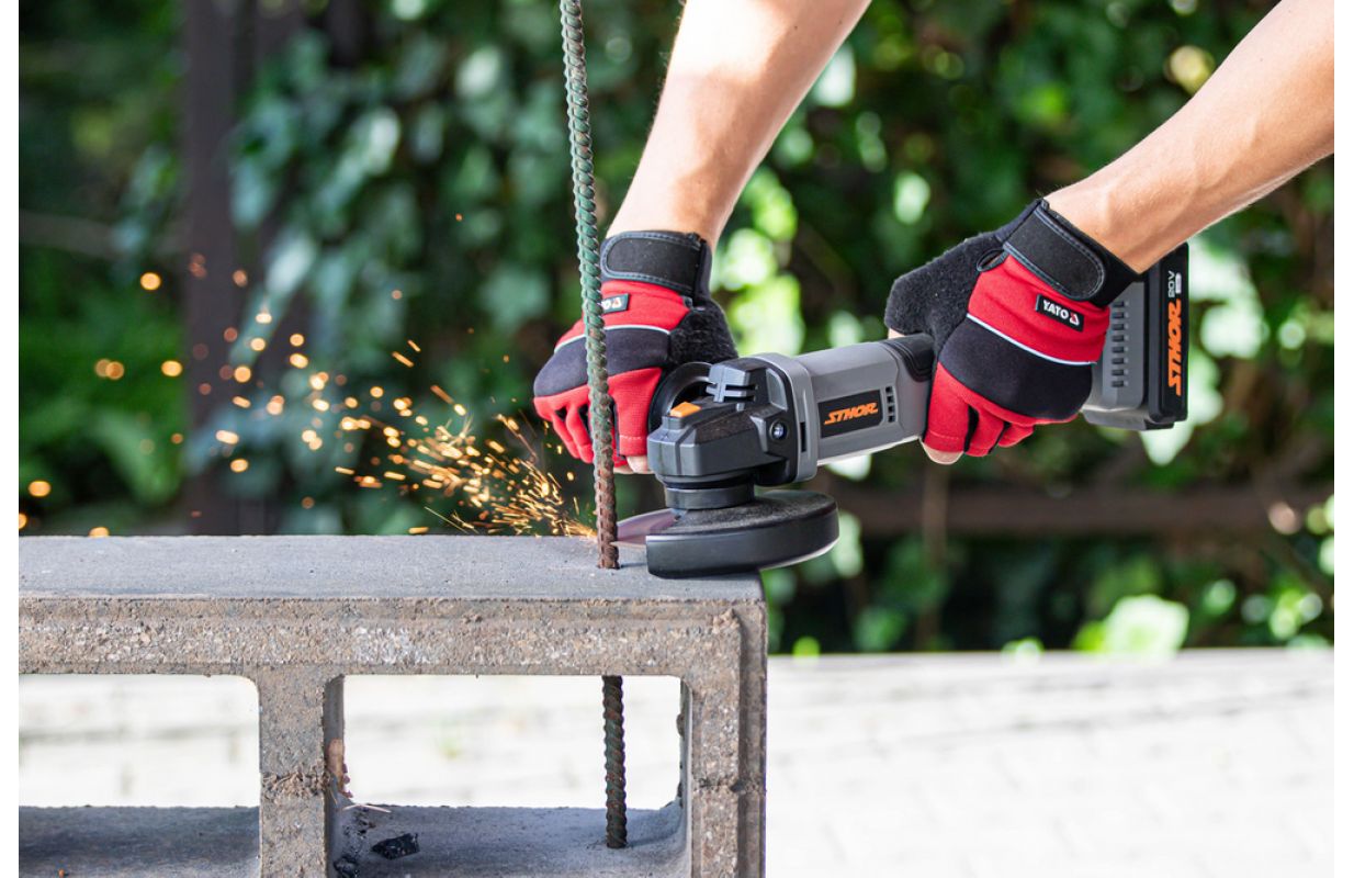 Bezvadu leņķa slīpmašīna ar lielu pārnesumkārbas griezes momentu. Augsta veiktspēja apvienojumā ar izturīgu un ergonomisku korpusu un izturīgu tērauda leņķa pārnesumkārbu ļauj ātri un droši sagriezt metāla elementus, griestu profilus, vītņotas tapas utt. Izmantojot 4 Ah akumulatoru, jauda ļauj sagriezt līdz 40 gabaliem, kas pārsniedz 80 griezumus. PCB sistēma nodrošina ilgu akumulatora darbības laiku, aizsargājot lietotāju no atsitiena, kas raksturīgs tradicionālajām ar elektrotīklu darbināmām leņķa slīpmašīnām.