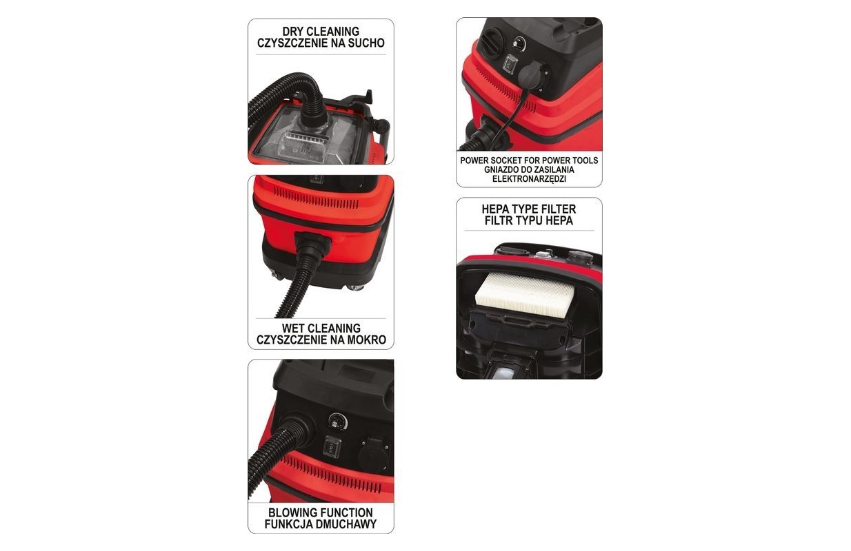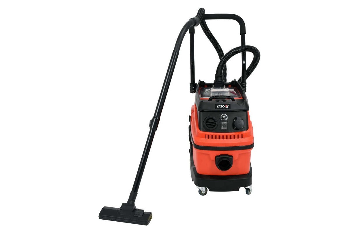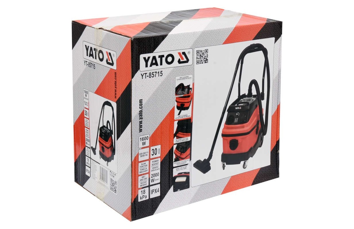 YATO profesionāls industriālais putekļsūcējs ar 1600 W jaudu un 18 kPa sūkšanas jaudu. Ir 30 litru tvertne. Putekļsūcējs var darboties gan sausajā, gan mitrajā tīrīšanā. Aprīkots ar pūtēja funkciju.
