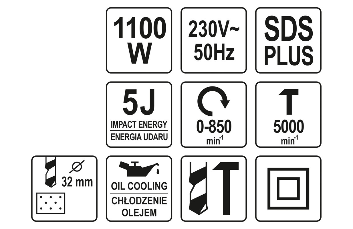 SDS-plus āmurs ar augstas veiktspējas un izturīgu elektropneimatisko mehānismu (5 J un 5000 sitienu minūtē), kas eļļots ar eļļas dzesēšanu, nevis smērvielu. Tam ir spēcīga ietekme uz urbšanu un kalšanu betonā un dzelzsbetonā. - 2 funkcijas: urbšana ar triecienu un kalšana