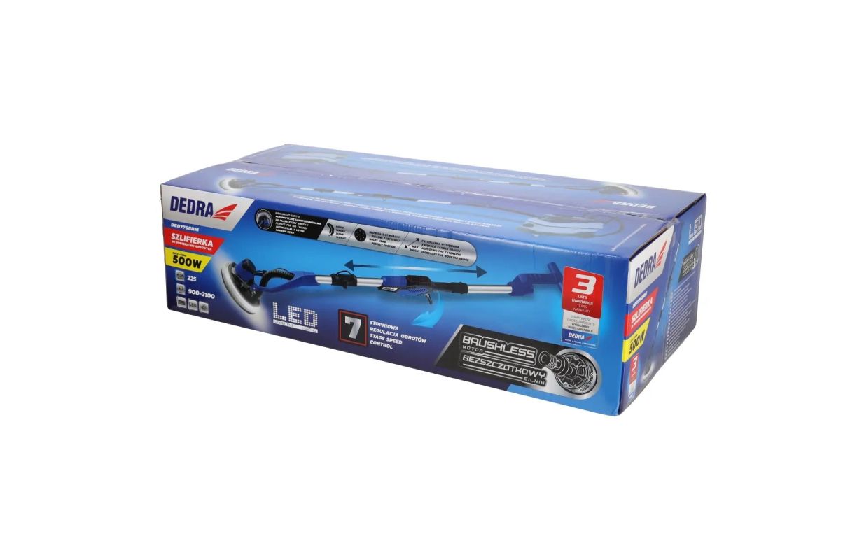 D EDRA DED7768 BM žiro stends ir paredzēts drywall slīpēšanai. Pateicoties motoram, kas uzstādīts tiešiuz diska, piedziņa tiek pārraidīta, izmantojot zobratu. Tas novērš kabeļa piedziņas nepieciešamību un garantē ilgu, bezrūpīguk al poš an as l ai ku . DED7768 BM ir 7 ātruma pakāpieni un putekļu nosūknēšanas sistēma, kas savienota ar ārējo putekļu sūcēju. Bezsuku motora izmantošana ir ļāvusi izveidot īpaši vieglu konstrukciju-mašīna viena pati sver 4,5 kg. Ērts, izturīgs koferis nodrošina ērtu glabāšanu un drošu transportēšanu. Teleskopiskā, salokāmā roka ļauj pielāgot ierīces garumu lietotāja augumam vai telpuapstākļiem. DEDRA DED6601, DED6602, DED6603, DED6604 ora ar Pansa m A063040 ora ar abrazīvajiem diskiem DED7749C0-DED7749C 6 unDED 7749 UW0-DED7749UW6