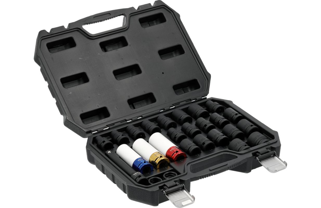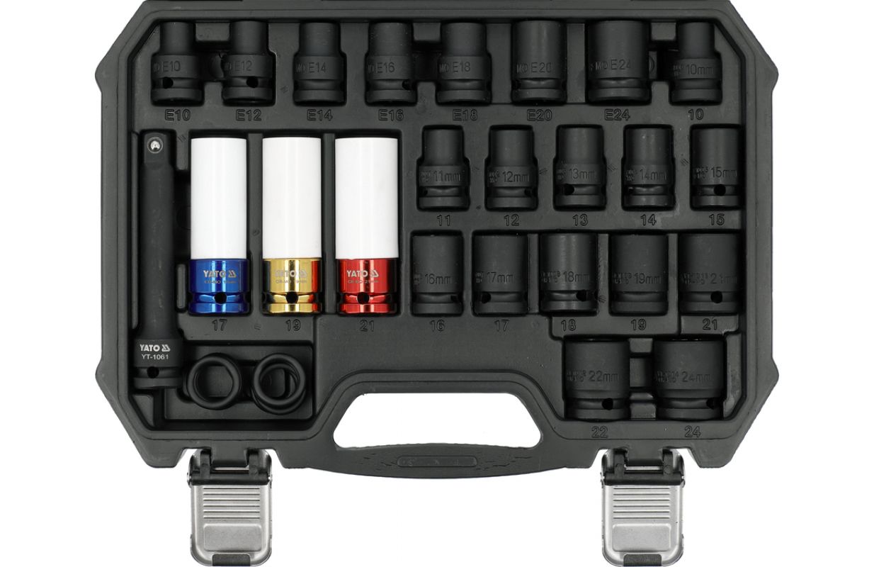 24 priekšmeti ar 1/2" (12.7 mm) piedziņu no hrommolybdena tērauda (CrMo) kalšana, lai palielinātu izturību pret plaisāšanu darba cietība 45±2 HRC As-Drive profils, kas aizsargā skrūvju malas pneimatiskajiem un elektriskajiem trieciena atslēgu instrumentiem komplekts ērtā pārvadāšanas kastē Komplektā iekļautais saturs: