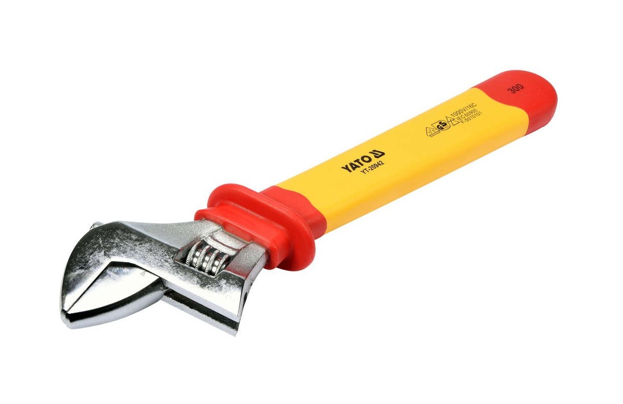 YT-20942 profesionāla regulējama uzgriežņu atslēga ar VDE izolētu rokturi, izgatavota no augstas kvalitātes CrV tērauda.