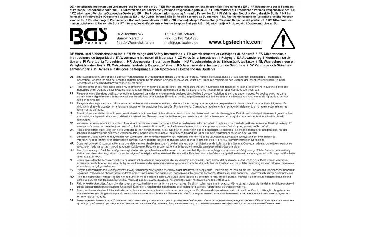 Apraksts Tehniskie dati Komplektācija izmantošanai elektrisko iekārtu jomā vai hibrīda un elektrisko automobiļu remontam un apkopei pārbaudīts saskaņā ar DIN EN/IEC 60900 kompakts komplekta sastāvs ar visbiežāk sastopamajiem izmēriem efektīva un uzticama piekļuve iebūvētajiem skrūvēm ultraplāni, nepārtraukti sašaurināti asmeņi melni uzgaļi ergonomiska 3-komponentu rokturis aizsardzība pret ripošanu, pateicoties asimetriskai roktura formai ar caurumu piek hanging komplektācija: 1 VDE skrūvgriezis | ultraplāns uzgalis | slīpums SL 3.5 mm (BGS 35854) 1 VDE skrūvgriezis | ultraplāns uzgalis | slīpums SL 4.0 mm (BGS 35855) 1 VDE skrūvgriezis | ultraplāns uzgalis | slīpums SL 5.5 mm (BGS 35856) 1 VDE skrūvgriezis | ultraplāns uzgalis | slīpums SL 6.5 mm (BGS 35857) 1 VDE skrūvgriezis | ultraplāns uzgalis | krustveida slīpums PH1 (BGS 35859) 1 VDE skrūvgriezis | ultraplāns uzgalis | krustveida slīpums PH2 (BGS 35860) 1 VDE skrūvgriezis | ultraplāns uzgalis | krustveida slīpums PZ1 (BGS 35862) 1 VDE skrūvgriezis | ultraplāns uzgalis | krustveida slīpums PZ2 (BGS 35863) 1 VDE skrūvgriezis | ultraplāns uzgalis | T-Star (Torx) T15 (BGS 35864) 1 VDE skrūvgriezis | ultraplāns uzgalis | T-Star (Torx) T20 (BGS 35865) 1 VDE skrūvgriezis | ultraplāns uzgalis | T-Star (Torx) T25 (BGS 35866)