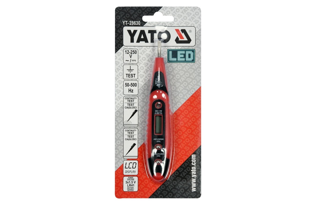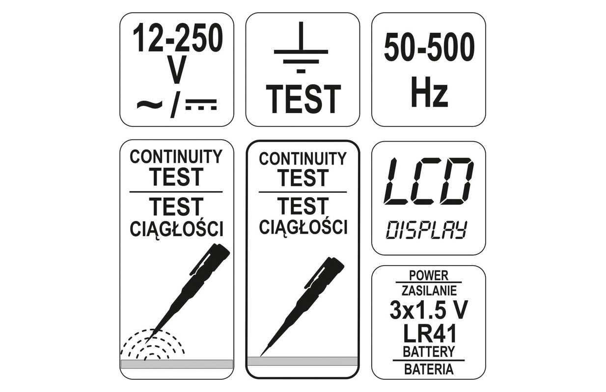 (Baterijas nav iekļautas komplektā) MAIŅSTRĀVAS/LĪDZSTRĀVAS SPRIEGUMA TIEŠAIS TESTA DIAPAZONS: 12V / 36V / 55V / 110V / 110V / 220V, INDUKCIJAS PĀRTRAUKUMPUNKTA TESTS, ZEMES PĀRBAUDE, NEONA LAMPA & LCD DISPLEJS, 3xBATTERIES LR41, SL TIP 2,9MM