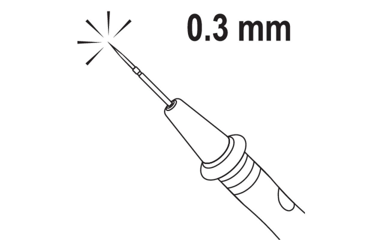 Mērīšanas zondes ar asiem misiņa galiem ar sudraba pārklājumu. Diametrs zondes galā ir tikai 0, 3 mm. Kabeļi ir izgatavoti no 80 konservētiem vara vadiem. Kabeļi ir pārklāti ar silikonu, elastīgu izolāciju, kas ir izturīga pret augstām temperatūrām. Zondes ir lieliski piemērotas mazu elementu mērīšanai, piemēram, viedtālruņu PCB. Tie viegli izlauzīsies cauri kabeļa izolācijai.