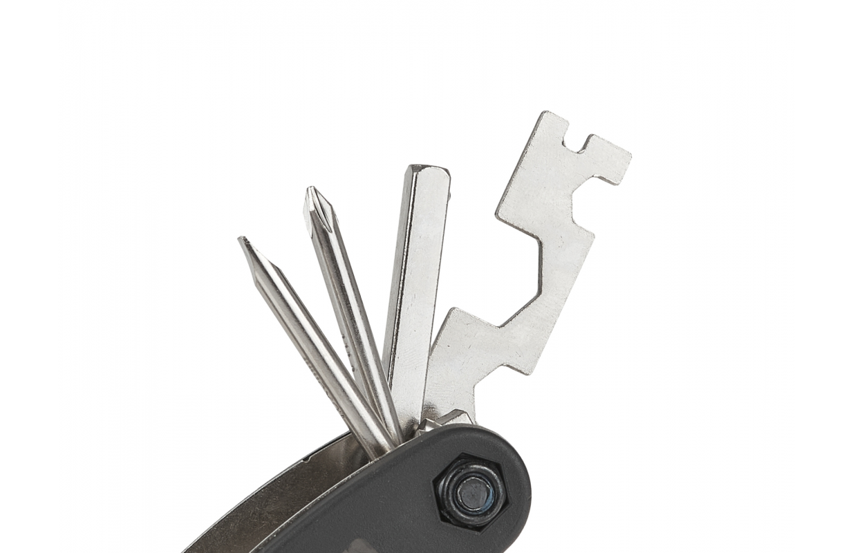 Pastiprināts niķelēts velosipēda uzgriežņu atslēgu komplekts ir daudzpusīgs rīks, kas ļauj viegli atskrūvēt un pievilkt dažādas velosipēda skrūves. Komplektā ietilpst 16 instrumenti, kas izstrādāti ērta kabatas naža formā, nodrošinot visaptverošu funkcionalitāti velosipēdu remonta un apkopes laikā.