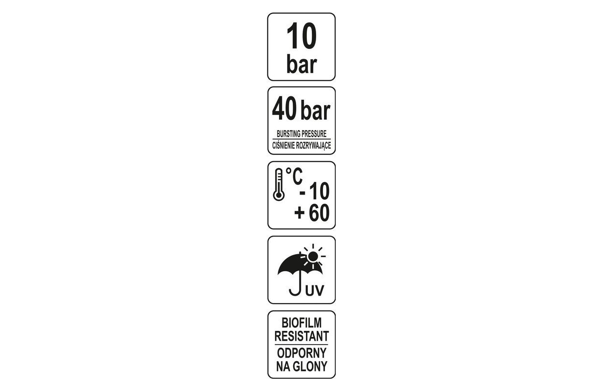Šļūtene ir izgatavota no mīksta PVC ar cietību 78 ShA, kas paredzēta ūdens sūknēšanai ar maksimālo darba spiedienu 10 bar 22 grādu C temperatūrā. Pārraušanas spiediens ir 40 bāri.