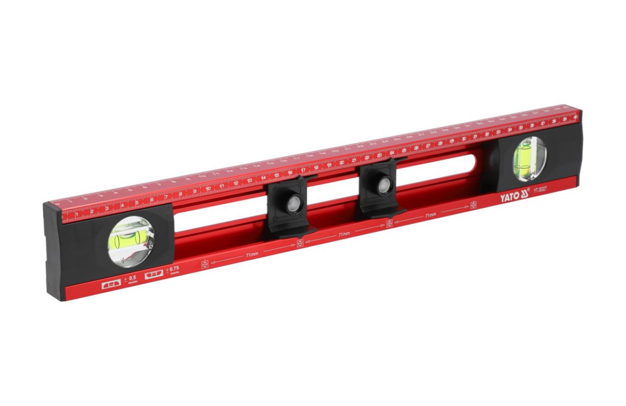 YT-30327 Līmeņrādis elektriķiem, kas ļauj ātri un precīzi izmērīt, izlīdzināt un atzīmēt attālumus. Ļauj pārnest un atzīmēt attālumus, izmantojot marķēšanas slīdņus uz mērījumu skalas. Kopējais garums: 400 mm
