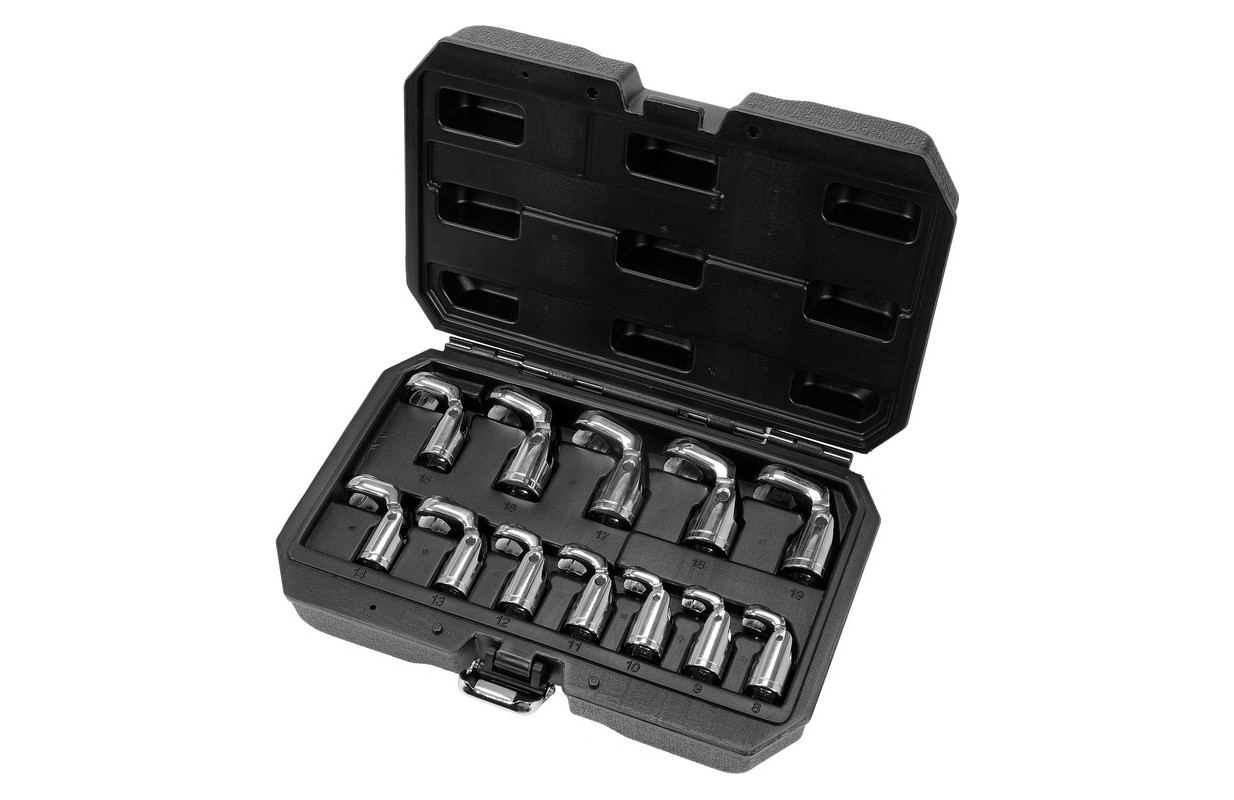 Kastes uzgriežņu atslēgu komplekts. Ideāli piemērots visu mērinstrumentu atskrūvēšanai un pievilkšanai ar elektrības vadiem, hidrauliskajiem, pneimatiskajiem vai degvielas vārstiem bez bojājumu riska. Atvērtās acis un ērta eņģe atvieglo darbu šaurās vietās. CRV materiāls ar cietību HRC 42-48 padara atslēgas izturīgas. Izturīgais plastmasas korpuss satur 12 izmērus no 8 līdz 19 mm.