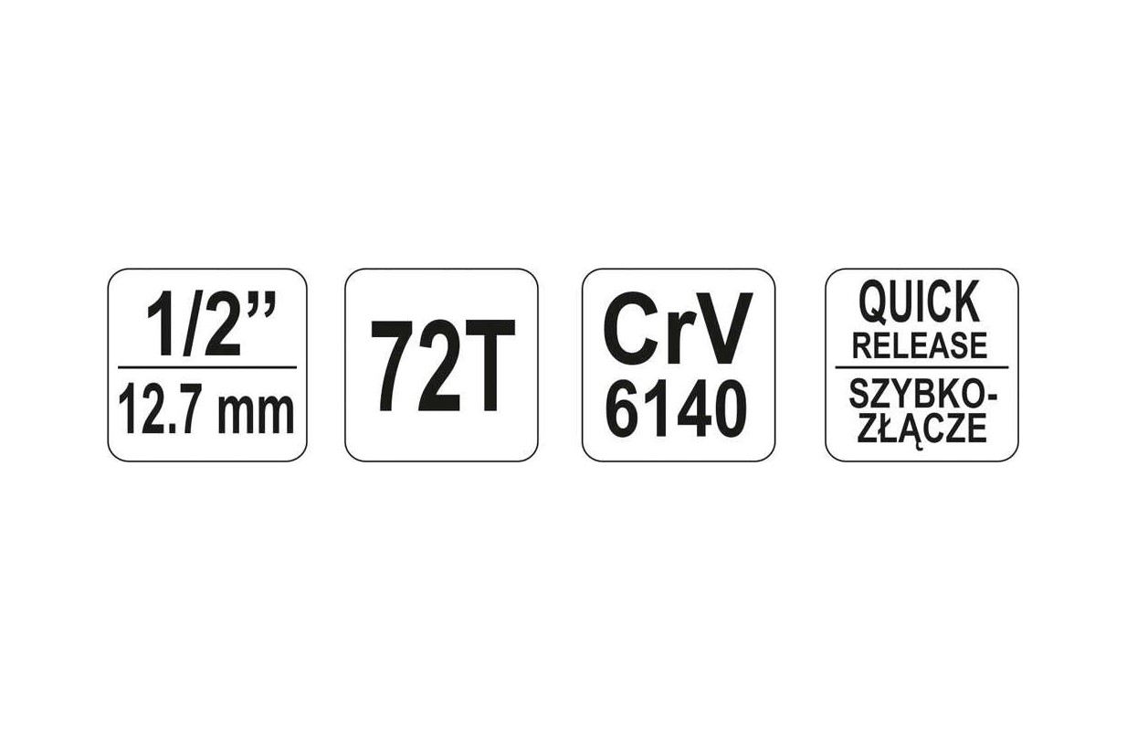Sprūdrats ir saliekts, lai ietilptu 1/2" ligzdām, garums 255 mm. Sprūdrats izgatavots no CrV6140 hroma vanādija tērauda. Sprūdrats aprīkots ar QUICK RELASE sistēmu un 72 zobu mehānismu. Minimālais gājiens 5°