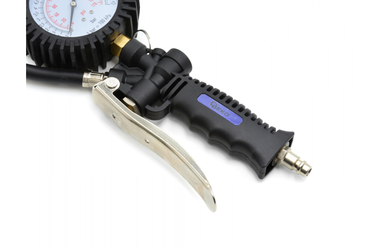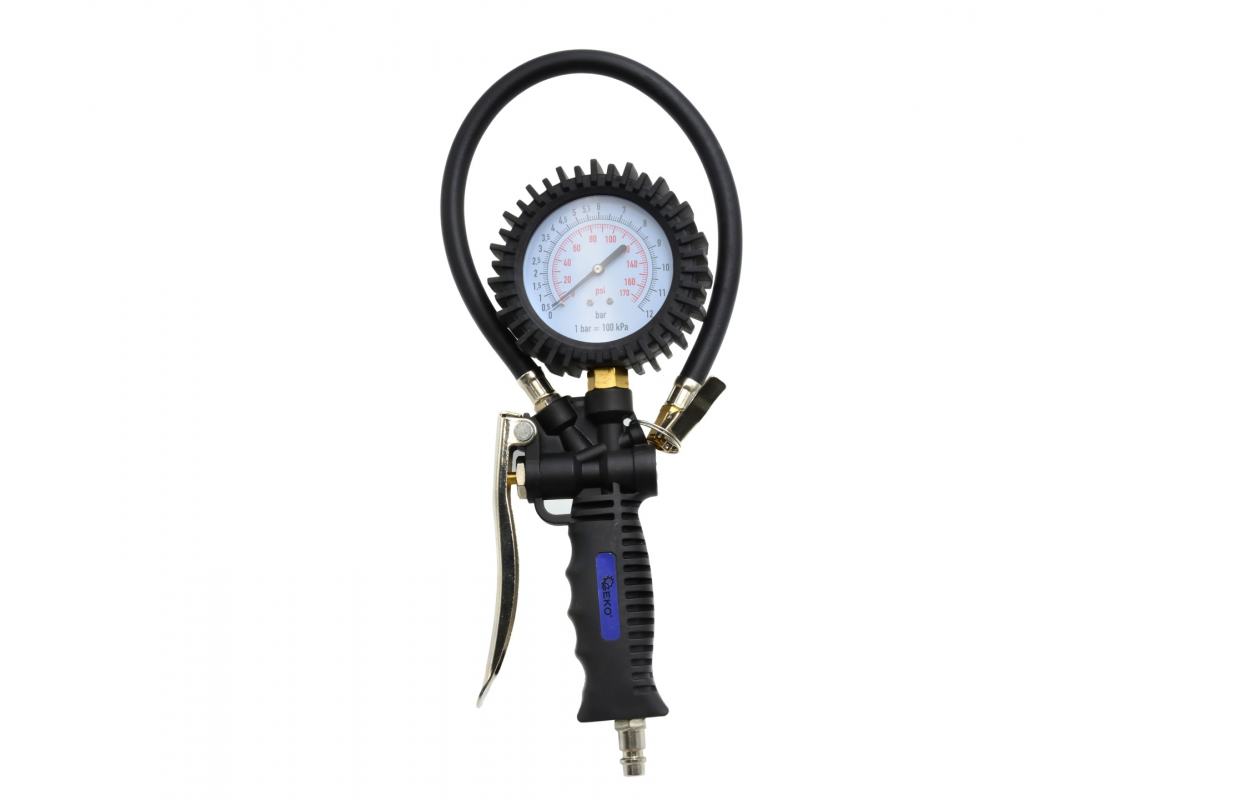 Profesionāls pneimatiskais lielgabals ar manometru - automašīnu un kravas automašīnu riteņu piepūšanai. Aprīkots ar 45 cm garu elastīgu šļūteni un lielu, viegli nolasāmu manometru gumijas zābakā triecienu un triecienu aizsardzībai. Mērīšanas skala ir divās vienībās - Psi un Bar. 1/4" ātra savienošana ļauj ātri izveidot savienojumu ar kompresoru.