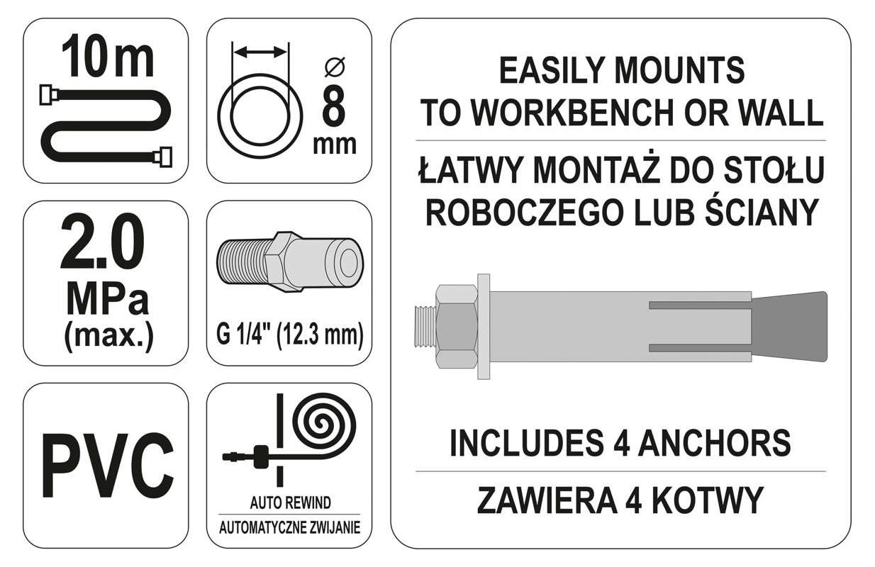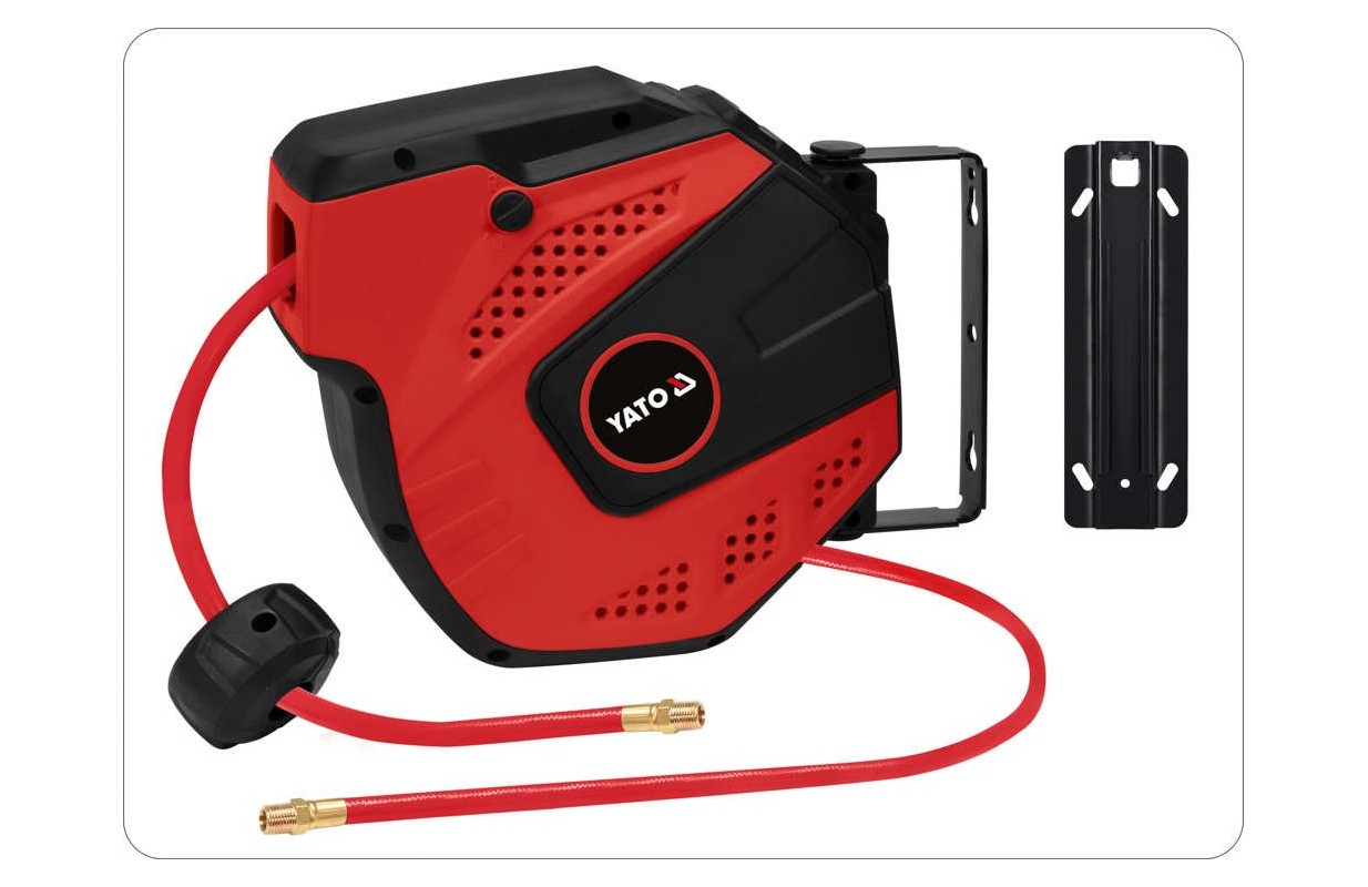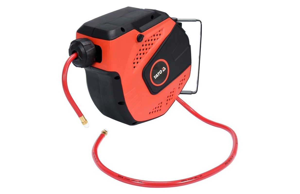 Pneimatiskā šļūtene 10 metru garumā uz automātiskas spoles. Nepieciešams pneimatisko instrumentu darbināšanai. Noder katrā darbnīcā un ražotnē.