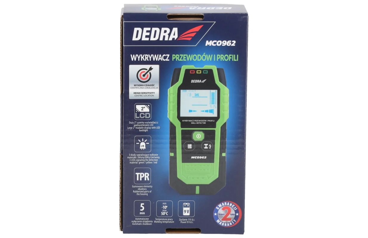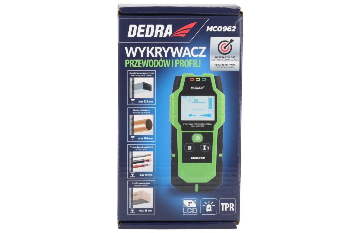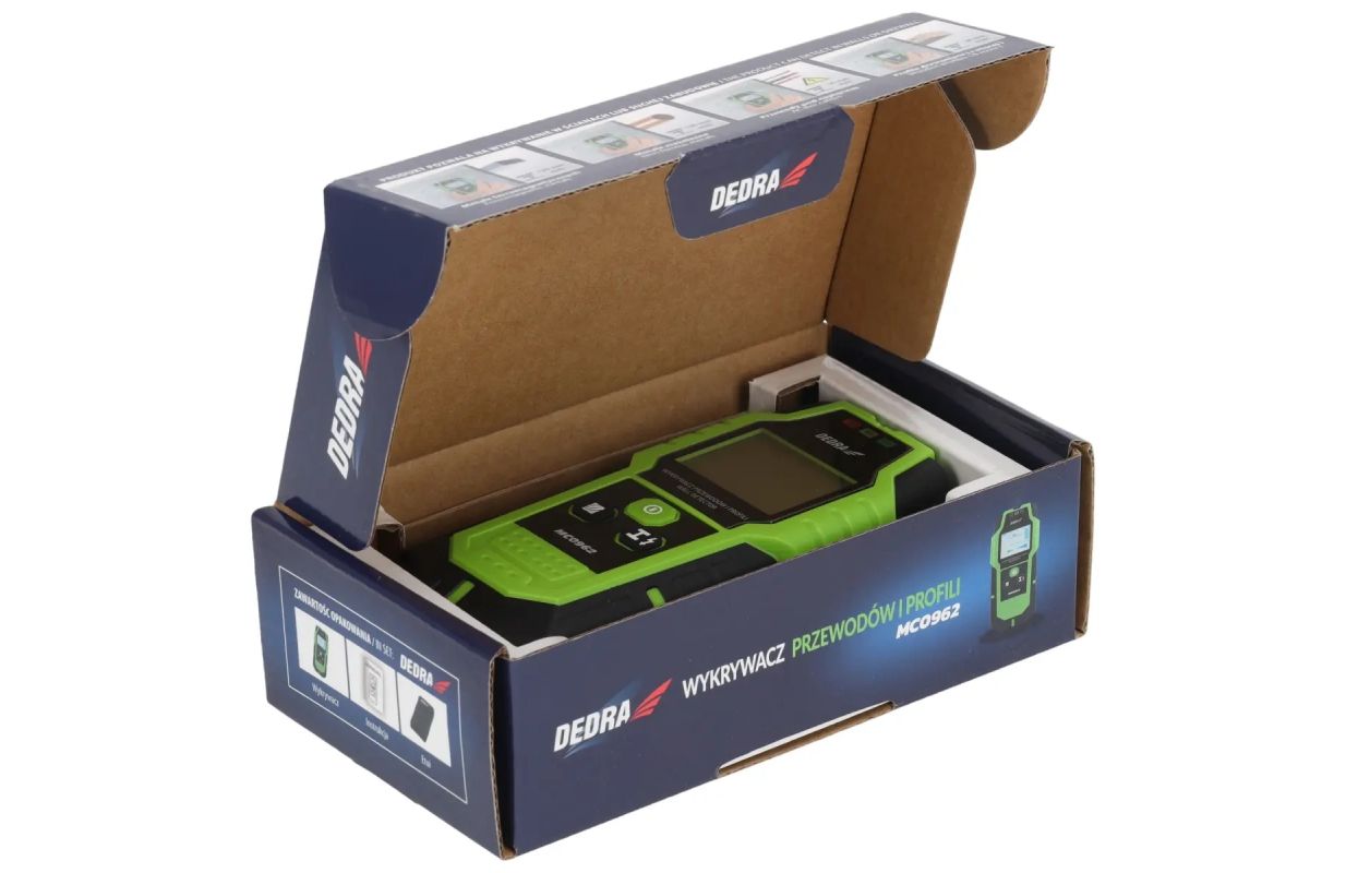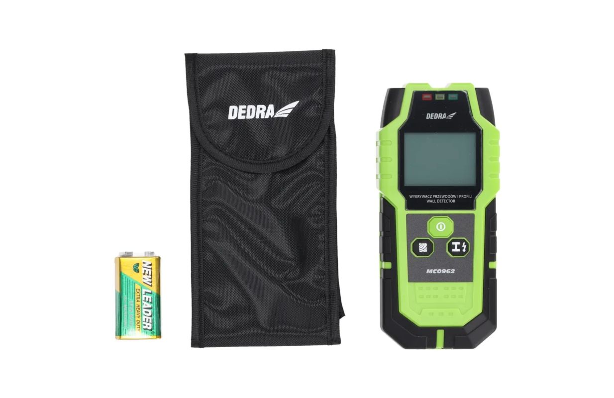 Ar DEDRA MC0962 kabeļuun profilu detektoru var noteikt metāla detaļas un profilus, maiņstrāvas un neelektriskās strāvas un koksni. Tas palīdz aizpildīt ēku tehnisko dokumentāciju. Augstas jutības sensorsun viegli nolasāms displejs ļauj precīzāk noteikt vajadzīgā o b j e k t a atrašanās vietu, līdz minimumam samazinot vadu vai elektrības kabeļu pārrāvuma risku. Turklāt kabeļu detektoram ir skaņas signāls,lai jūs nepalaistu garām brīdinājumus. Detektors ir komplektā ar somiņu, stiprinājumu pie jostas un lietošanas instrukciju.