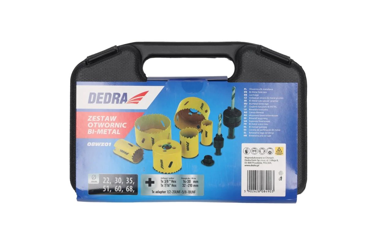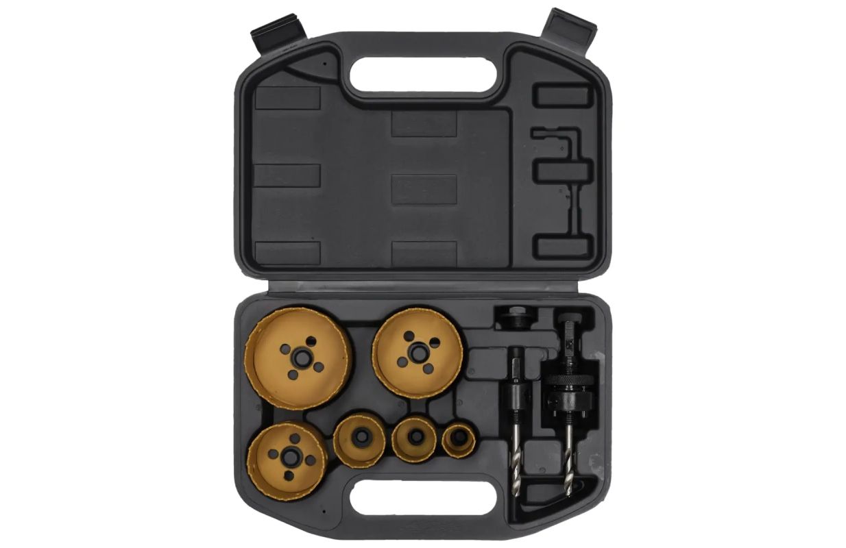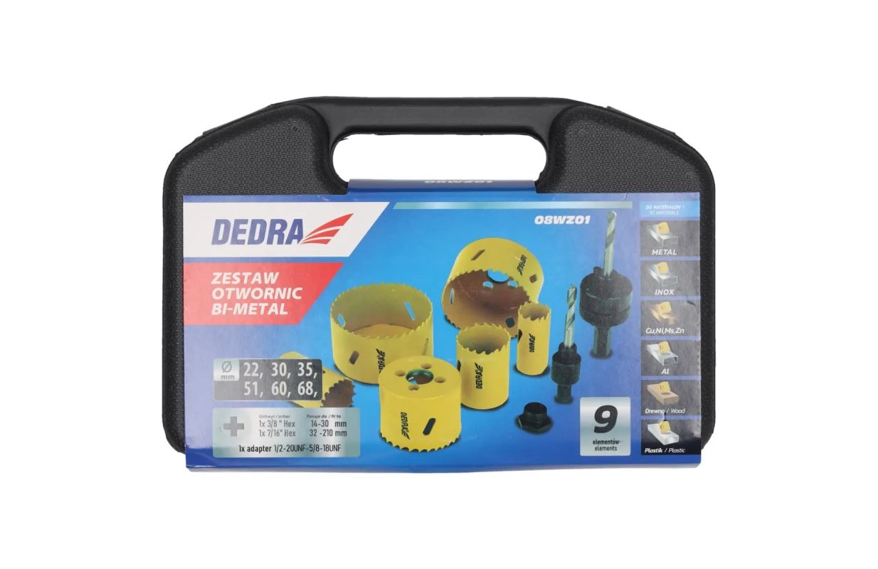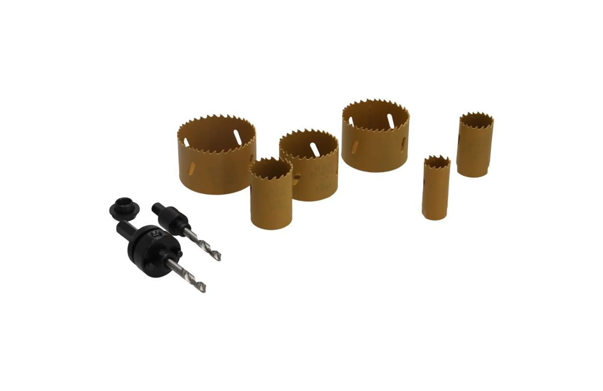 Sets ar 2 kātu un 6 divmetālu caurumu zāģiem caurumu izgatavošanai tādos materiālos kā metāls, nerūsējošais tērauds,k r ās ai n i e metāli, alumīnijs, koks un plastmasa. Caurumi ir izgatavoti no augstas kvalitātes ātrgriezējtērauda HSS. Izspiešanas leņķis un attālums starp zobiem nodrošina efektīvuun ātru caurumu urbšanu. Lietojot caurumu zāģi, ir svarīgi izmantot piemērotu dzesēšanas šķidrumu un ātrumu pielāgot urbjamajam materiālam.