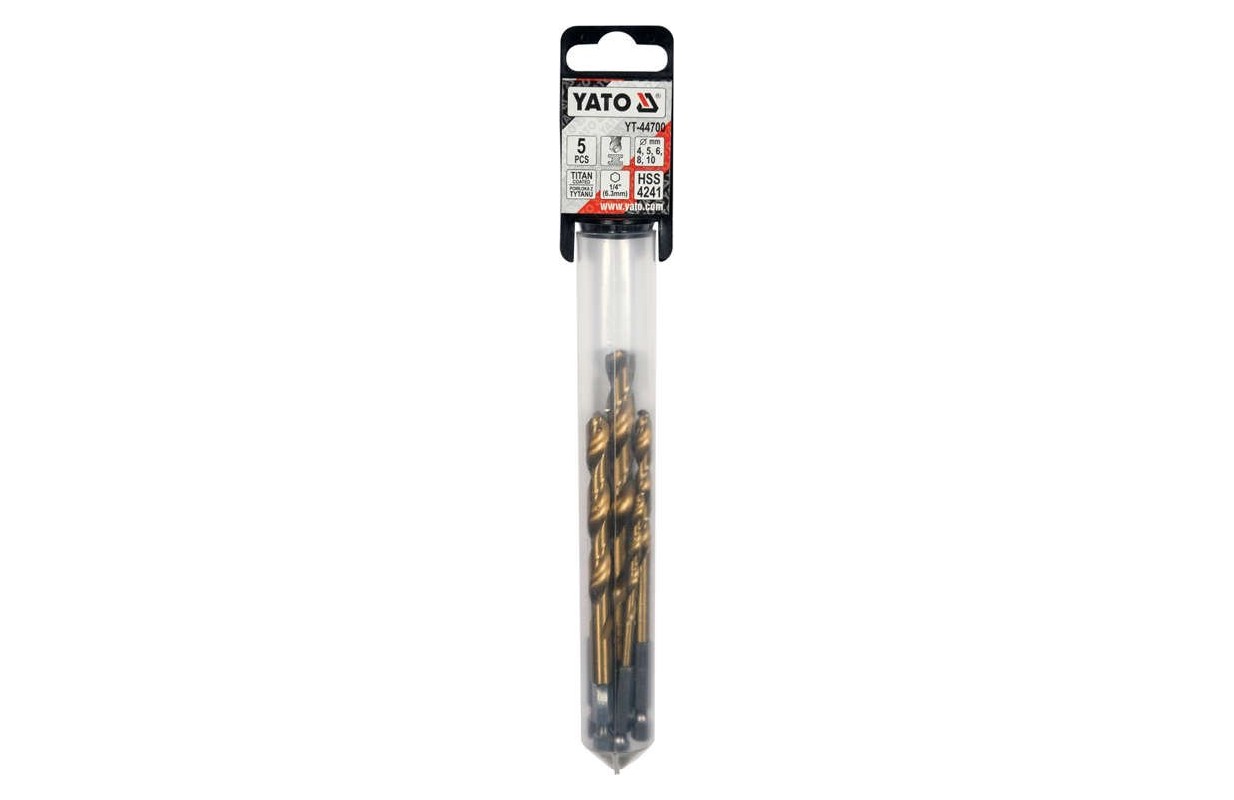 Urbju komplekts ar titāna pārklājumu metālam ar sešstūra rokturi YATO YT-44700. Izgatavots no ātrgaitas tērauda HSS, pārklāts ar titāna pārklājumu. Sadalīšanas punkts ļauj veikt urbšanu bez caurumu iepriekšējas caurumošanas. Urbju malas ir slīpētas. Asināšanas leņķis 135 grādi. Izurbjot cietu tēraudu, tie ātri izkliedē siltumu, nesadedzinot urbi.