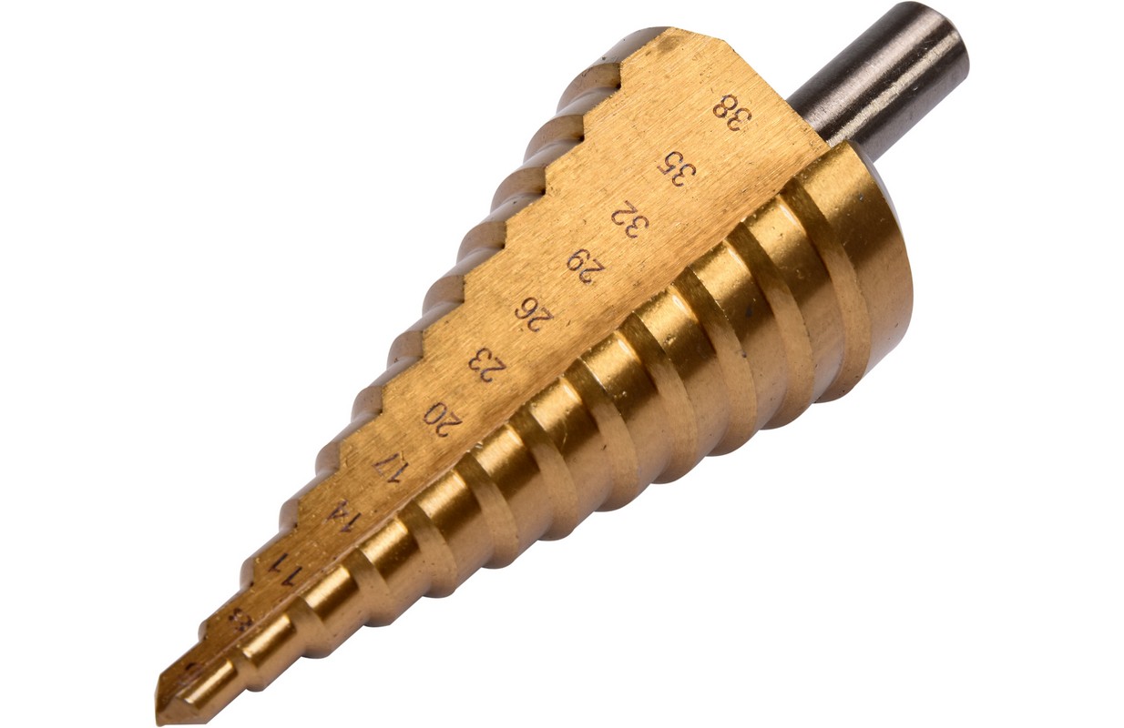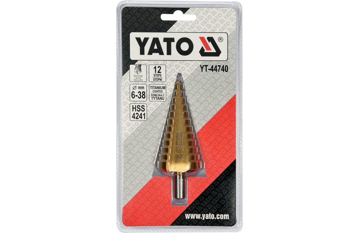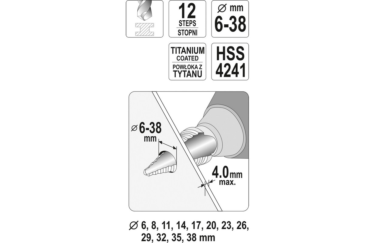 YATO YT-44740 Stepper urbis 6-38 mm. Izgatavots no ātrgaitas tērauda HSS 4241, pārklāts ar titāna nitrīdu. 12 grādu diametrs: 6; 8; 11; 14; 17; 20; 23; 26; 29; 32; 35; 38 mm, apaļš rokturis.