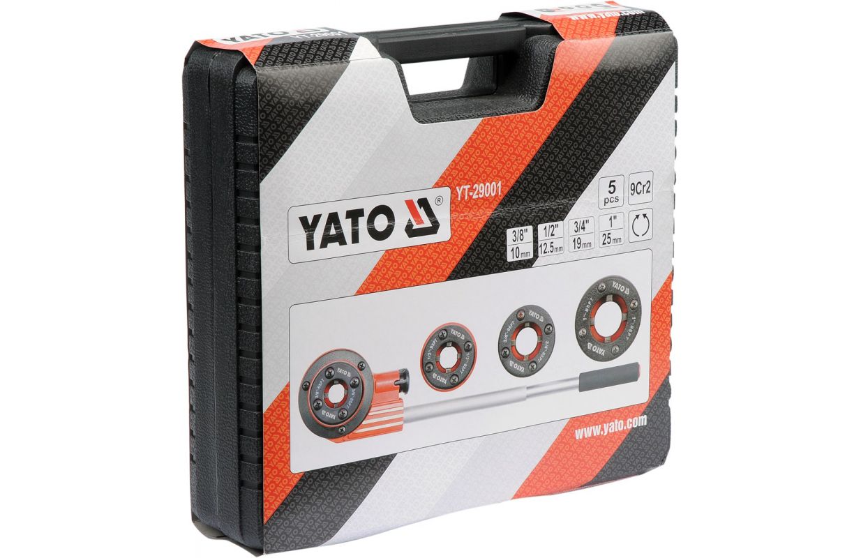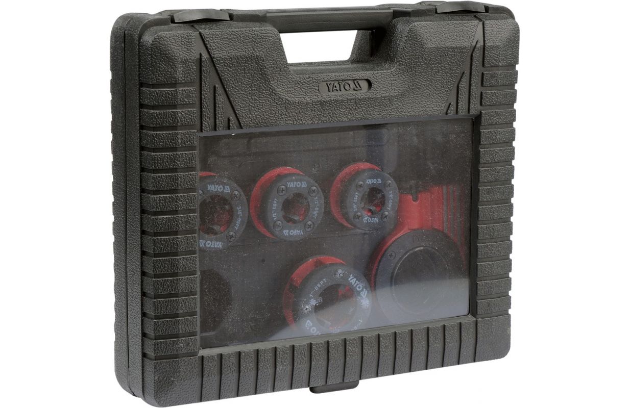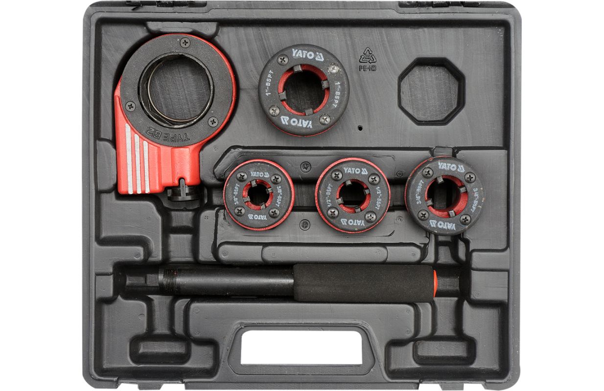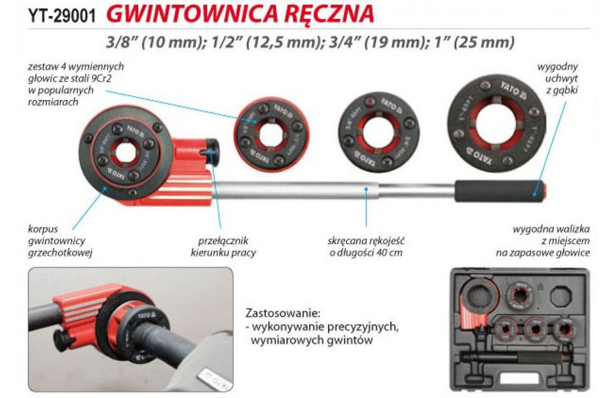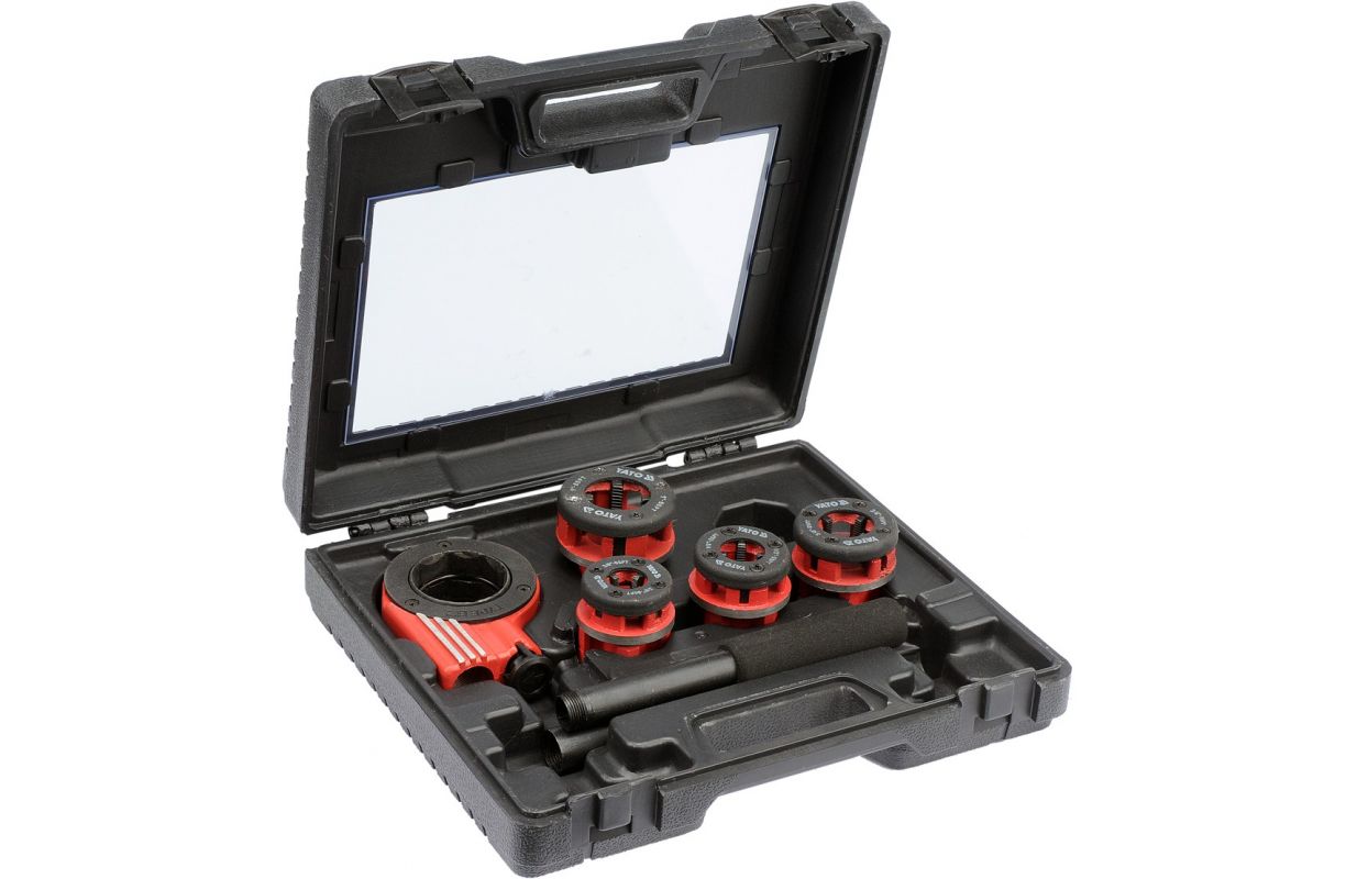 Augstas kvalitātes vītņošanas komplekts. Komplektā ietilpst spararats ar sprūdrata sistēmu, kas ievērojami atvieglo darbu, un virziena slēdzis. Komplektā ietilpst 4 maināmas galvas ar izmēriem 3/8" (10mm), 1/2" (12,5mm), 3/4" (19mm), 1" (25mm). Galvas ir izgatavotas no ļoti izturīga un izturīga materiāla 9Cr2. Komplekts ir iepakots plastmasas korpusā visu priekšmetu pārvadāšanai un uzglabāšanai.