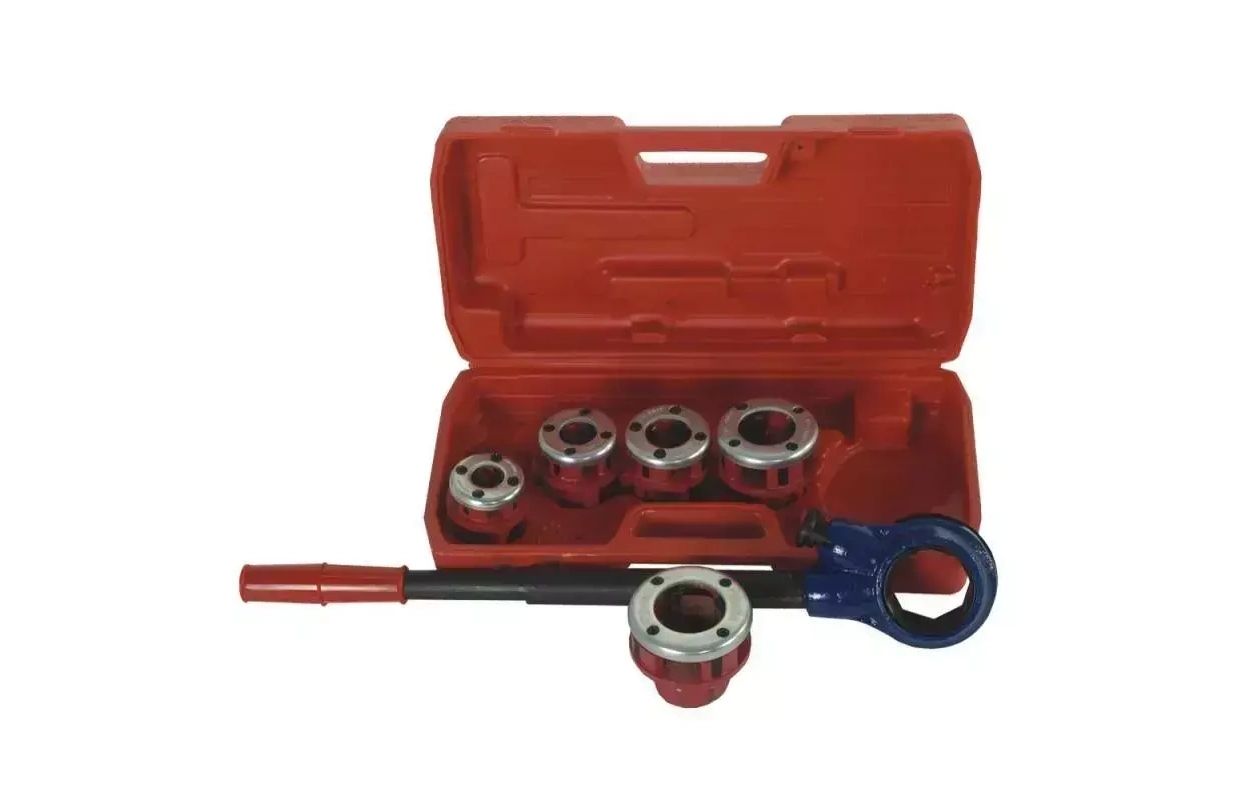 5 vītņukomplekts vītņu griešanai. Komplektā ir arī sprūdrats, kas atvieglo un paātrina darbu ar presformām. Iepakots funkcionālā un praktiskā plastmasas kastītē.