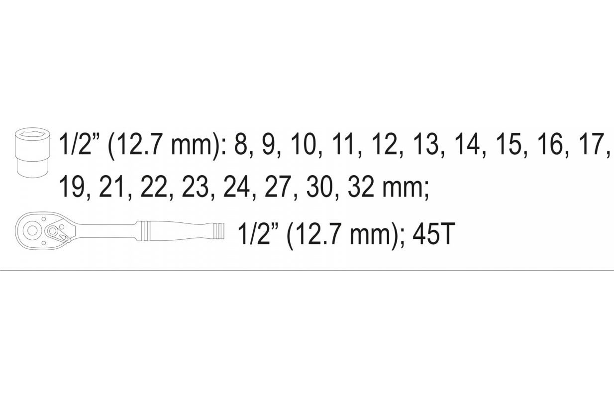 Sešstūru komplekts 1/2 " Komplektā ietilpst šādi gala galviņu izmēri 8, 9, 10, 11, 12, 13, 14, 15, 16, 17, 19, 21, 22, 23, 24, 27, 30, 32 mm, sprūdrata/sprūdrata rokturis/ 1/2"45T.