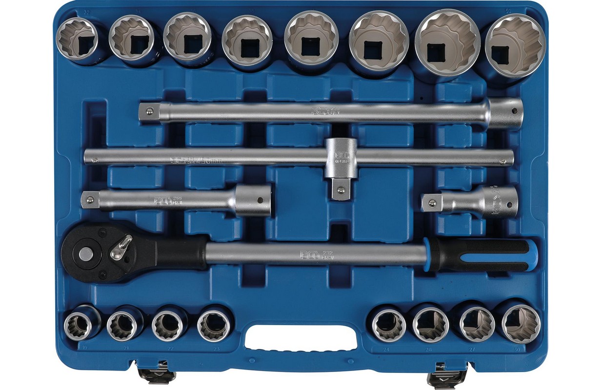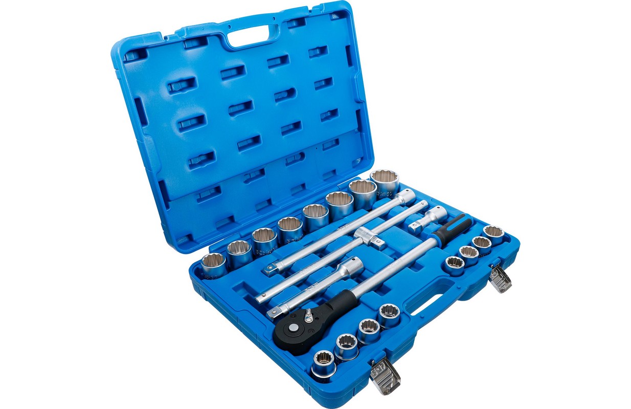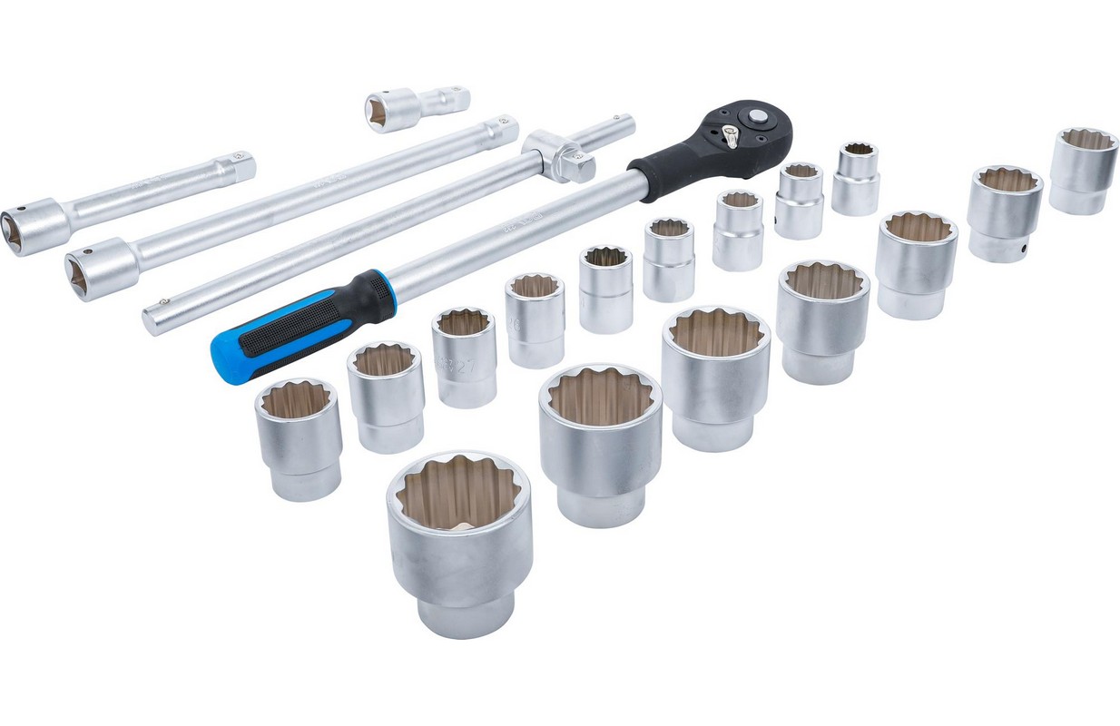 12 punktu ligzdas, 20 mm (3/4") iekšējais kvadrāts: 19 - 21 - 22 - 23 - 24 - 26 - 27 - 30 - 32 - 34 - 36 - 38 - 41 - 46 - 48 - 50 mm