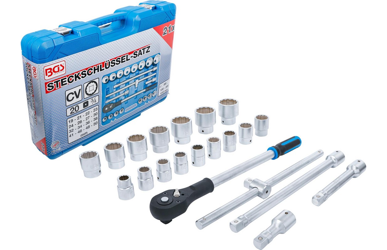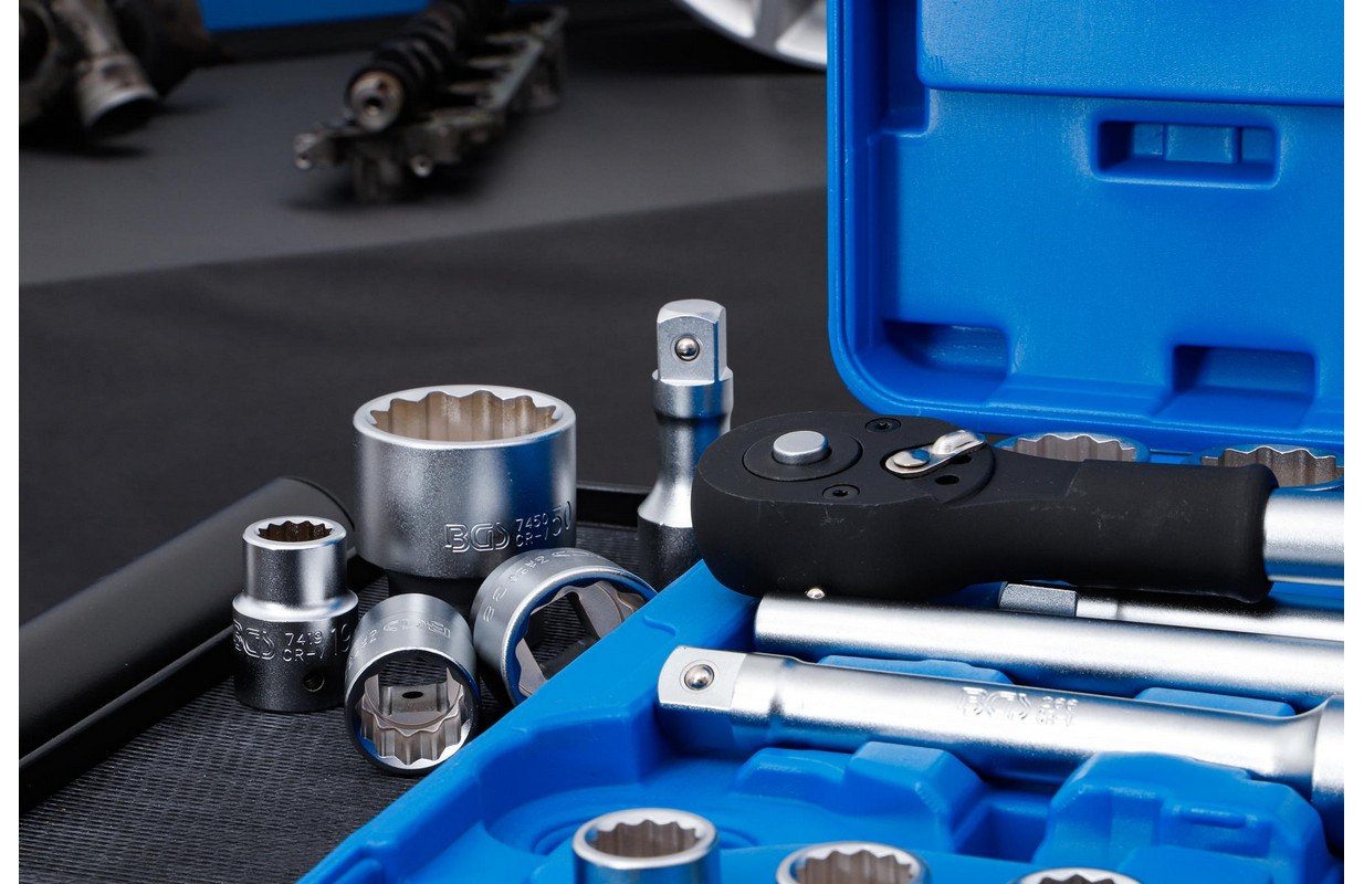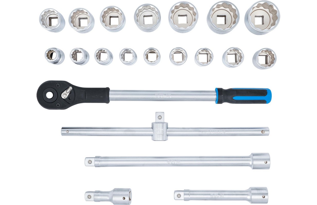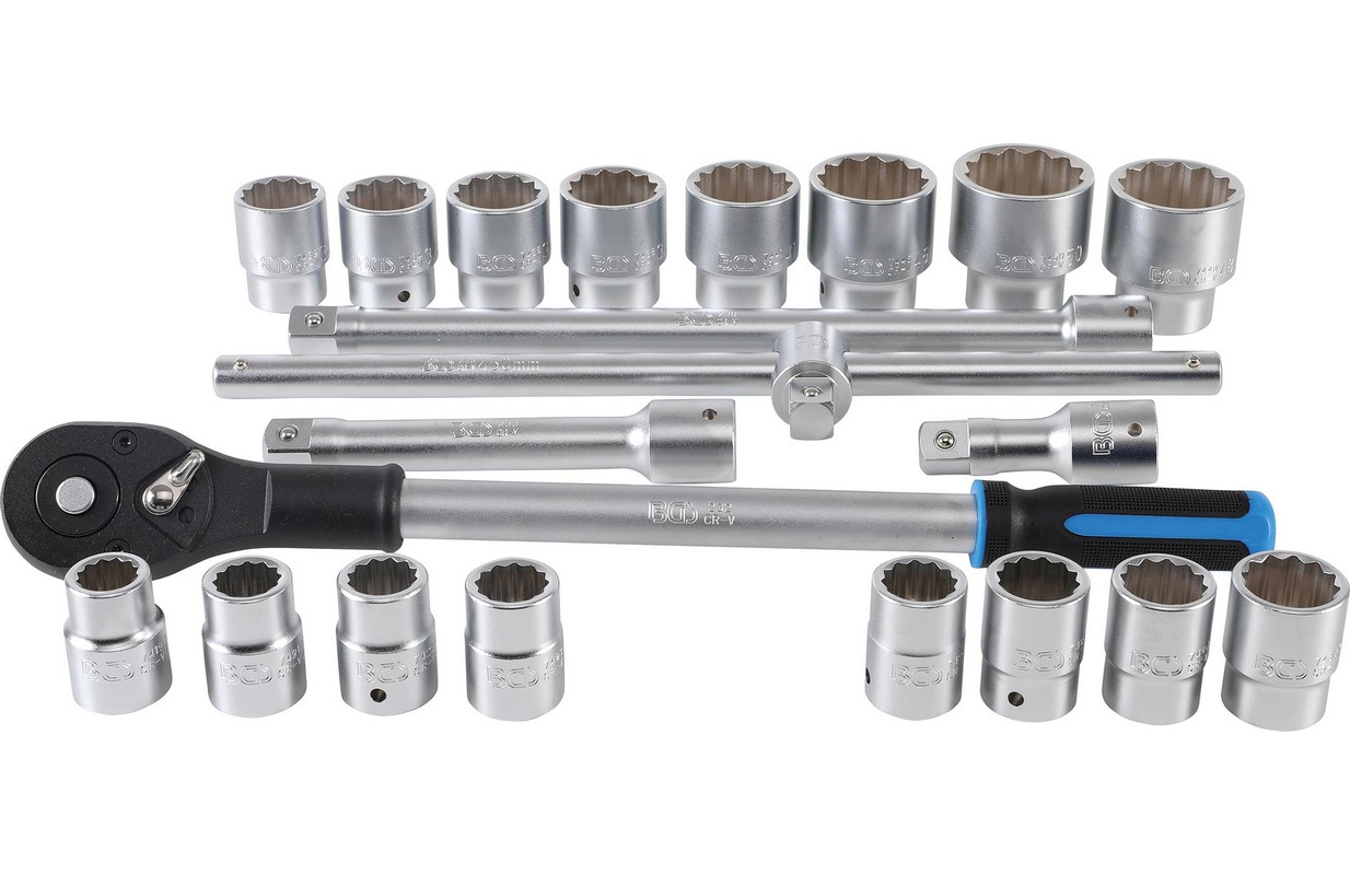 12 punktu ligzdas, 20 mm (3/4") iekšējais kvadrāts: 19 - 21 - 22 - 23 - 24 - 26 - 27 - 30 - 32 - 34 - 36 - 38 - 41 - 46 - 48 - 50 mm