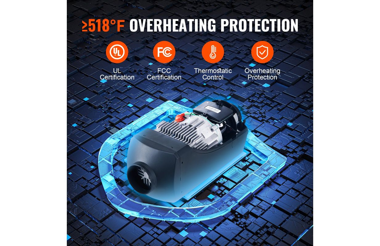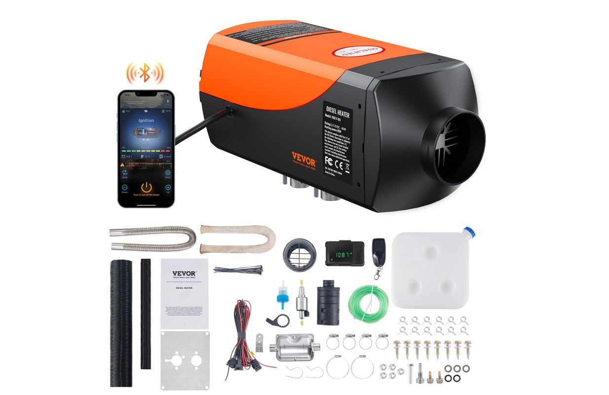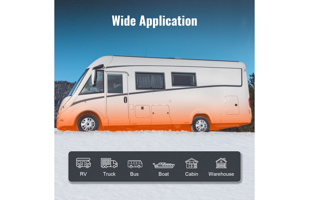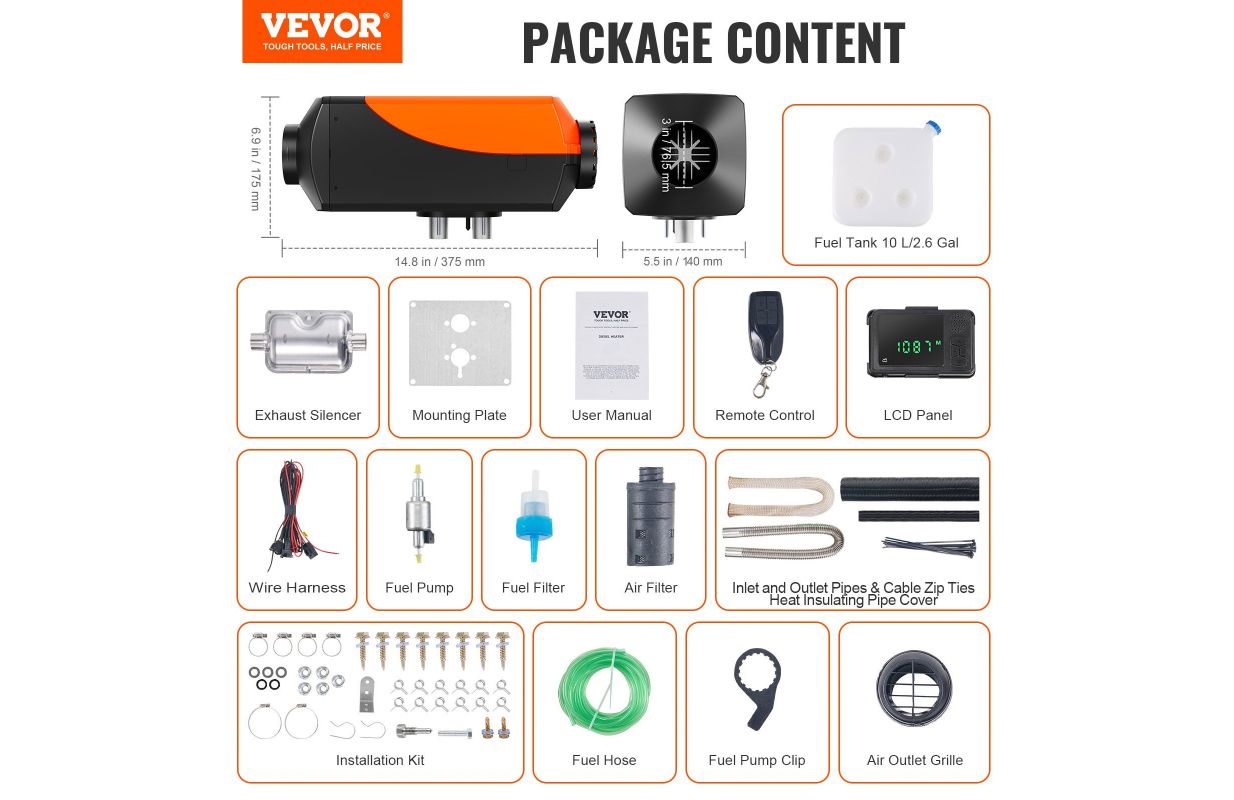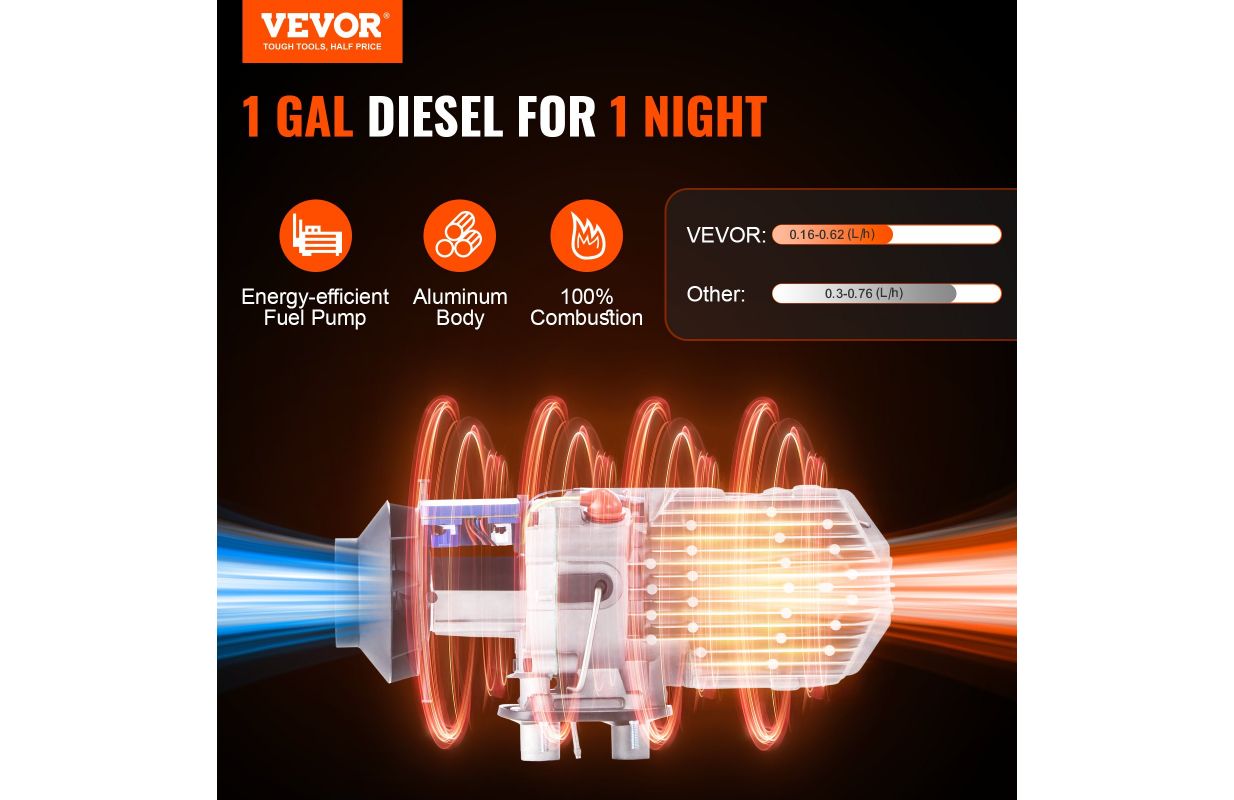 • Efektīva apkure: Sildītāja jauda: 8 kW; Nominālā spriegums: 12V. Piemērojamais diapazons: 20-25 m². VEVOR dīzeļa gaisa sildītājs izmanto smilšu alumīnija siltummaini, lai ātri ražotu un pārraidītu siltumu, nodrošinot komfortablu temperatūru jūsu automašīnā, laivā vai kabīnē 10 minūšu laikā.
