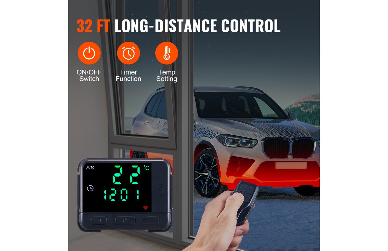 • Inteliģenta dubultā vadība: Vadīt savu sildītāja pieredzi ar mūsu tālvadības pulti, kas darbojas attālumā līdz 32 pēdām un LCD displeju. Iepriekš sasildiet savu automašīnu no ārpuses, uzturiet siltumu iekšpusē, iepriekš sasildiet dzinēju un novērsiet logu apledošanu. Lielais LCD displejs ļauj jums skaidri redzēt savas sildītāja statusu. Temperatūru var regulēt no 8 °C līdz 36 °C, ņemot vērā jūsu konkrētās vajadzības.