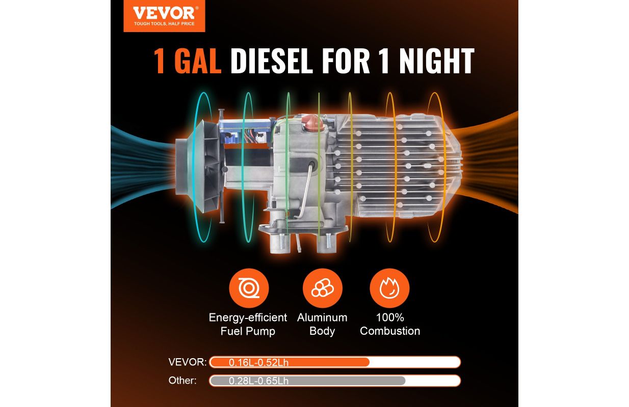• Zems enerģijas patēriņš un augsta veiktspēja: Ietaupiet degvielas izmaksas, izmantojot precīzu un klusu dīzeļsildītāja degvielas sūkni, kas patērē apmēram 1 galonu degvielas naktī un samazina degvielas patēriņu no 0,16 l/h līdz 0,52 l/h. Ar lielu 5 l/1,3 galonu degvielas tvertni dīzeļsildītājs var nodrošināt nepārtrauktu apkuri līdz 10 stundām, maksimizējot degvielas efektivitāti un minimizējot enerģijas zudumus.