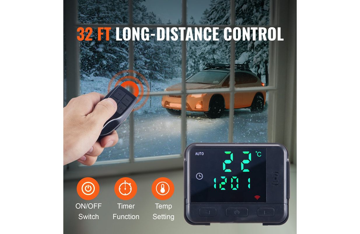 • Inteliģenta dubultā vadība: Pārvaldiet savu apkures pieredzi ar mūsu 32 pēdu attālumā esošo tālvadības pulti un LCD displeju. Iepriekš sasildiet savu automašīnu no ārpuses, uzturiet siltumu iekšpusē, iepriekš sasildiet dzinēju un novērsiet logu aizsalšanu. Lielais LCD displejs ļauj jums skaidri redzēt savas sildītāja stāvokli. Temperatūru var regulēt no 8 °C līdz 36 °C, atbilstot jūsu konkrētajām vajadzībām.
