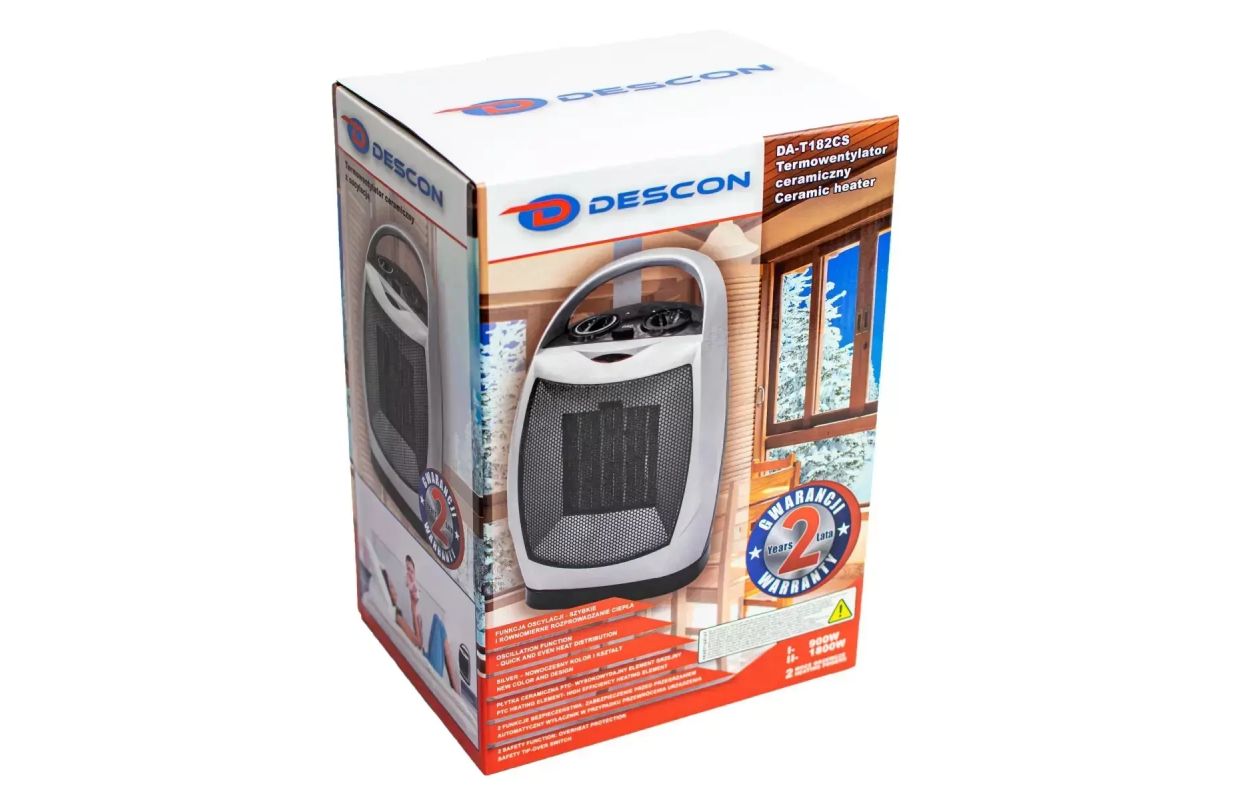 Keramiskais ventilators DA-T182 CS irierīce, kas paredzēta nelielut e l p u , piemēram, virtuvju, vannas istabu, biroju, dzīvojamo un saimniecības telpu zonālai apsildīšanai. Pateicoties keramiskajam sildelementam, karstums ir jūtams uzreiz pēc aktivizēšanas. Ierīcei ir 3 gaisa izplūdes režīmi: vēss, karsts un silts. Oscilācijas funkcija palīdz labāk sadalīt silto gaisu telpā. Iebūvētais termostats ļauj precīzi iestatītt em p er at ūru . DA-T182CS termoventilatoram ir iebūvēta aizsardzība pret pārkaršanu un automātiskās atiestatīšanas drošības slēdzis(ja ierīce tiek apgāzta, strāvas padeve tiek pārtraukta).Ierīcei ir kompakts izmērs un ērts rokturis pārnēsāšanai.