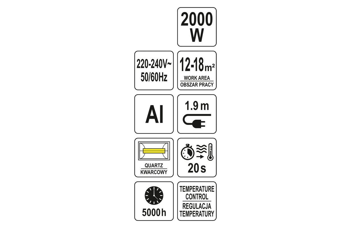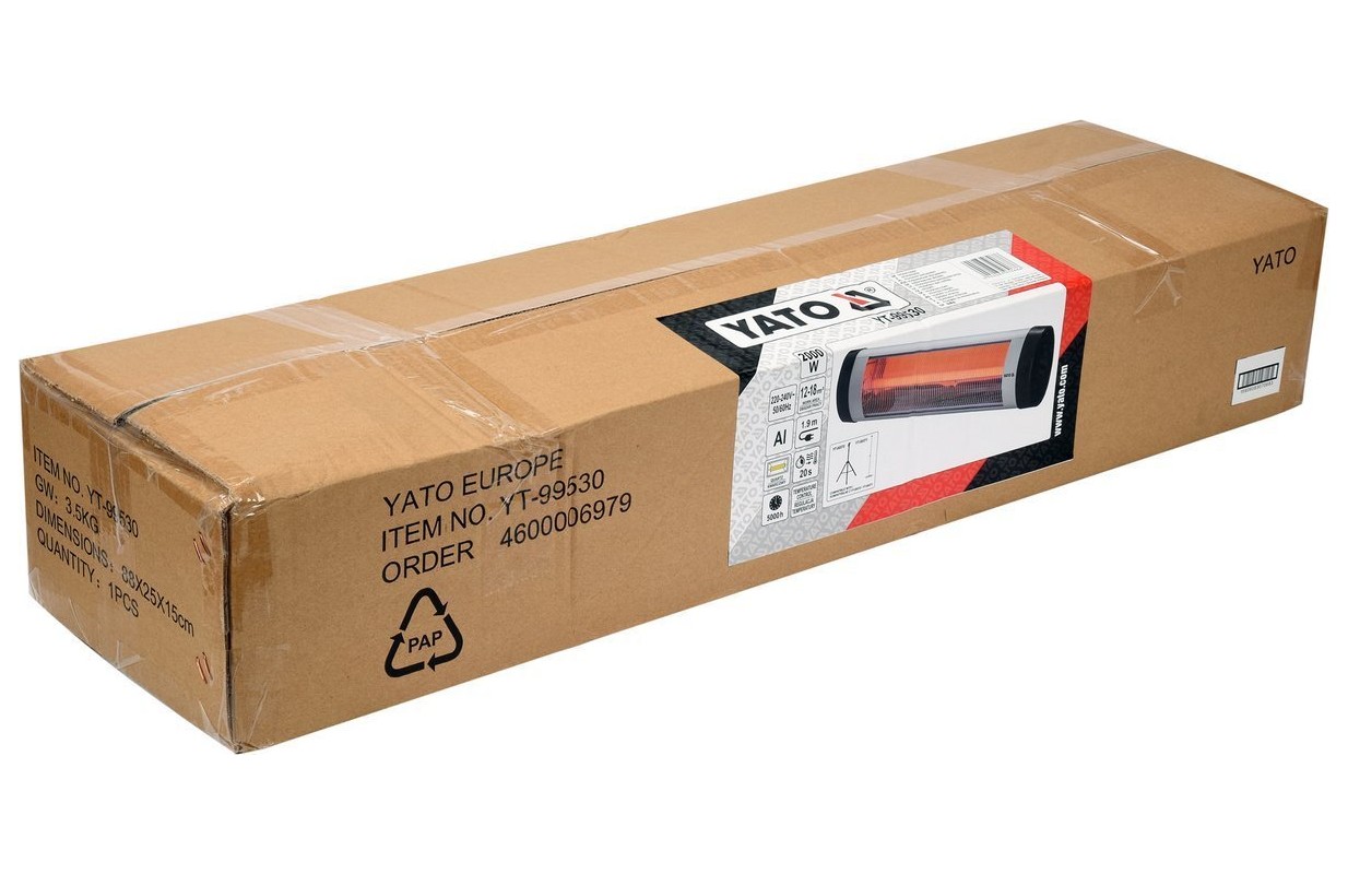Yato infrasarkanais sildītājs ir ideāli piemērots darba vietas apsildīšanai vai atpūtai aukstās dienās un naktīs. Aprīkots ar ātri uzkarstošu kvarca lampu, tā spēj izolēt aptuveni 12-18m2 lielu platību. Montāžas komplekts ļauj uzstādīt sildītāju pie sienas, griestiem un Yato statīva (YT-99570, YT-99571). Papildu priekšrocība ir temperatūras kontrole , ko var pielāgot valdošajiem laikapstākļiem.