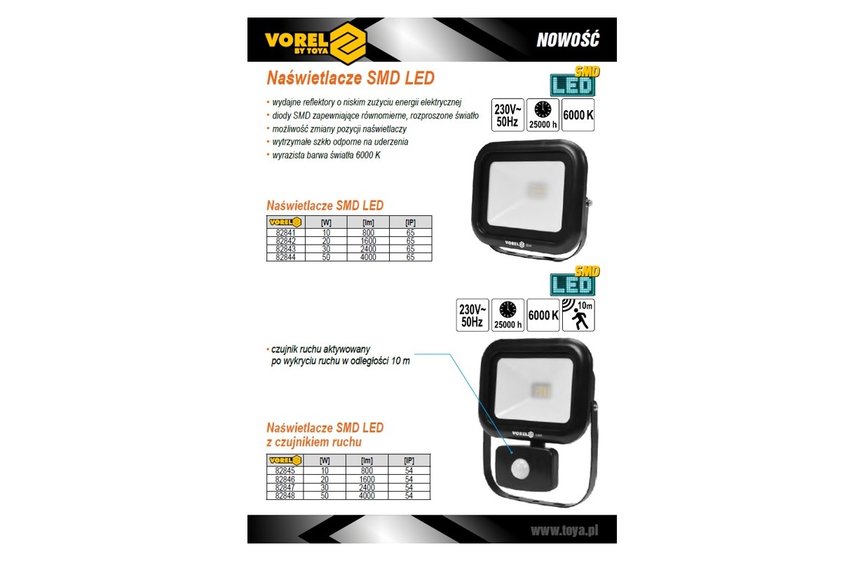 SMD LED 10W 800LM; POLIKARBONĀTA KORPUSS AR ALUMĪNIJA PLĀKSNI; SPRIEGUMS: MAIŅSTRĀVA 220-240V, 50HZ; CCT: 6000K; IZMĒRĪTĀ KRĀSU REPRODUCĒŠANA (RA): > 80; PF: > 0,5; KALPOŠANAS LAIKS: 25000 STUNDAS; NOMINĀLAIS STARU KŪĻA LEŅĶIS GRĀDOS: 120°; No 0. KABELIS 3M H05RN-F 2G1.0MM2; IP AIZSARDZĪBAS PAKĀPE: IP54; PIR KUSTĪBAS SENSORS: NOTEIKŠANAS LEŅĶIS: 120°, NOTEIKŠANAS DIAPAZONS: 10M, LAIKA REGULĒŠANAS DIAPAZONS: 15C ~ 10MIN, NOTEIKŠANAS GAISMAS REGULĒŠANAS DIAPAZONS: 10LUX ~ 2000LUX