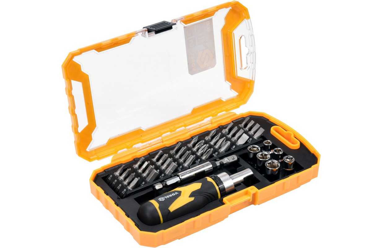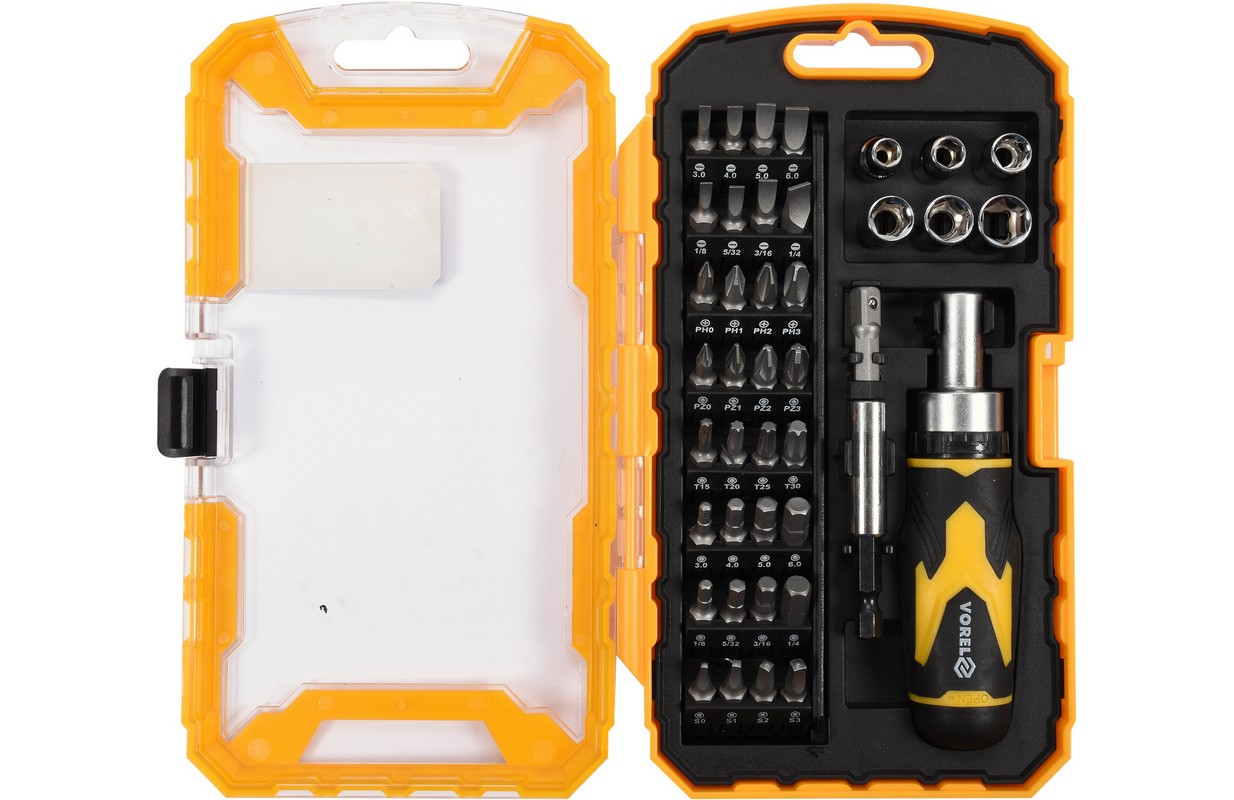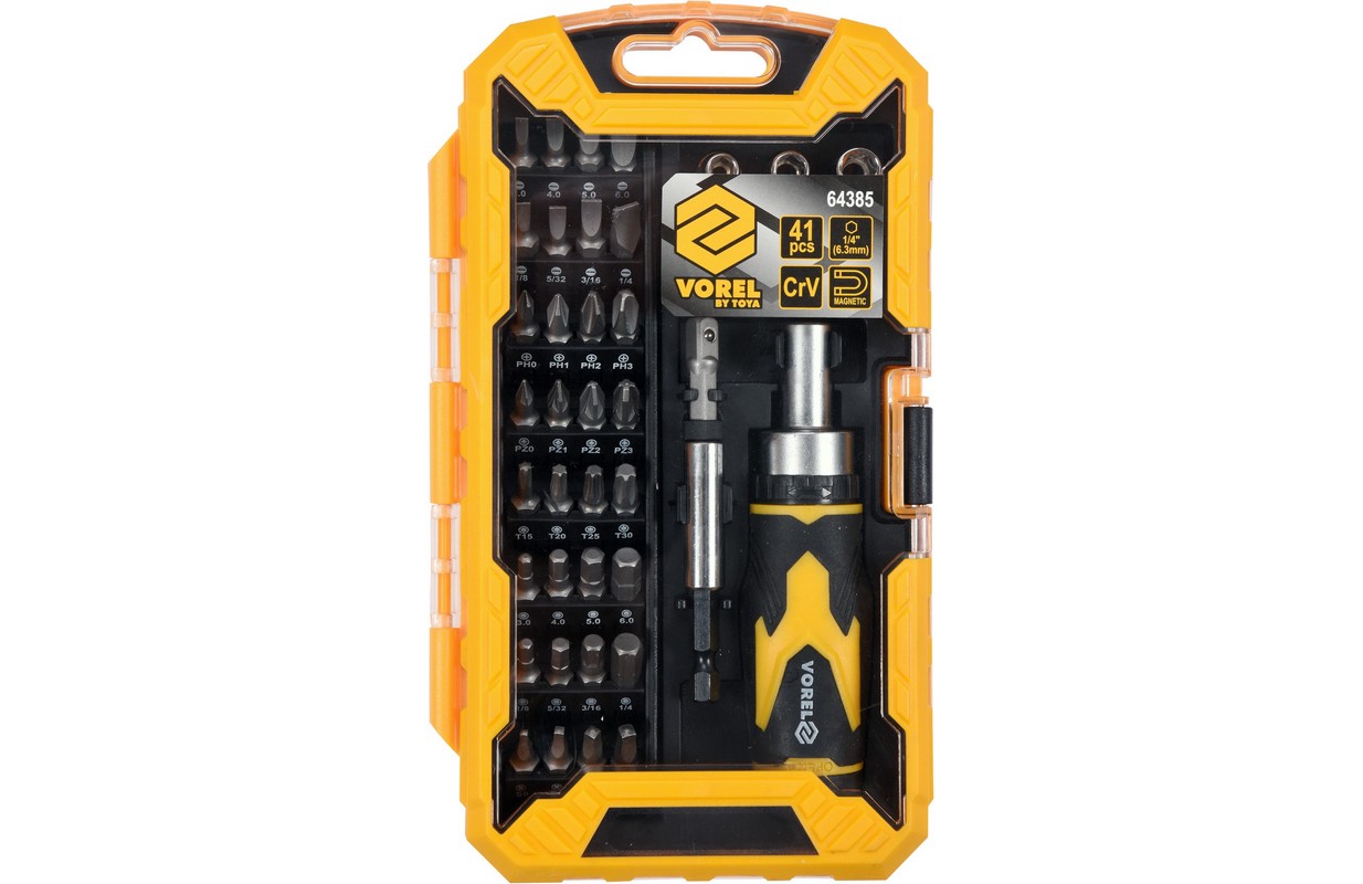 Skrūvgriezis ar nomaināmiem uzgaļiem Vorel 64385. Tam ir izturīgs ergonomisks rokturis, kas aprīkots ar sprūdratu ar slēdzi.