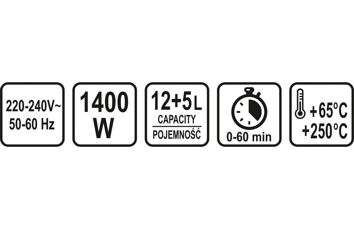 Bļodas tilpums [l] 12 + 5 POWER 1400 W; SPRIEGUMS 220-240V 50HZ; CELTSPĒJA 12 L (MAKS. 17 L AR PAGARINĀJUMA GREDZENU); 2 ROKTURI – LAIKA UN TEMPERATŪRAS IESTATĪŠANA; TAIMERIS 0-60 MIN; TEMPERATŪRA 65-250C GRĀDI; MICROSWITCH; KARSTUMIZTURĪGA, RŪDĪTA STIKLA BĻODA, AKSESUĀRI: ZEMS STATĪVS, AUGSTS STATĪVS, KNAIBLES, NERŪSĒJOŠĀ TĒRAUDA PAGARINĀJUMA GREDZENS, VĀKA TURĒTĀJS, MAIZES STATĪVS, PĀRKLĀTA PANNA, ALUMĪNIJA TVAICĒTĀJS, KRĀSAINS BALTS