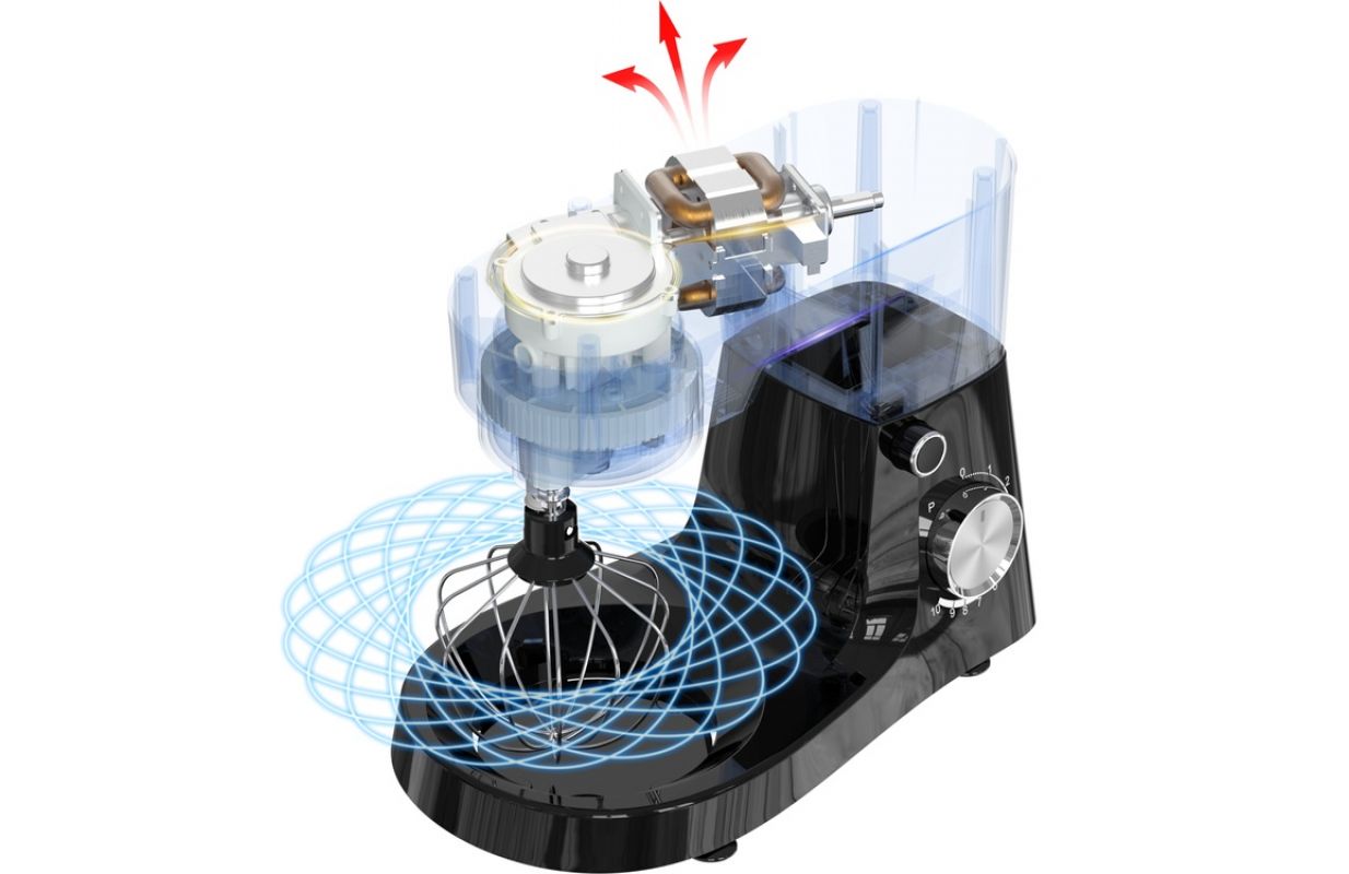 Nominalā jauda: 1500 W (AC 220–240 V ~ 50–60 Hz) – nodrošina augstu sajaukšanas spēku pat ar blīvām mīklām. Stabils darbs un CE sertifikāts garantē drošību un uzticamību. Maksimālā jauda (pīķa): 2500 W - Motors ar nominālo jaudu 1500 W īslaicīgi sasniedz līdz 2500 W, kad tas tiek iedarbināts un strādājot ar blīvām sastāvdaļām. Tas nodrošina augstu griezes momentu un efektīvu smagas mīklas mīcīšanu bez pārslodzes riska. Motors ACC (maiņstrāva ar slēdzi) - efektīvs maiņstrāvas bloks, kas paredzēts darbam zem smagām slodzēm. Ideāli piemērots planētas mikseriem. Raksturojas ar augstu griezes momentu, kas ļauj viegli tikt galā ar blīvām mīklām un ilgstošu mīcīšanu. Nodrošina stabilu jaudu, gludu ātruma kontroli, augstu ilgmūžību un ir izturīgāks pret pārslodzēm nekā standarta universālie motori. Gluda kontrole 10 ātrumiem + impulsu režīms - Precīza ātruma kontrole ļauj ideāli pielāgot darba tempu katram recepšu. Impulsu režīms nodrošina tūlītēju jaudu, kad tas ir nepieciešams. Planētas sajaukšanas sistēma - Planētas kustība nodrošina rūpīgu visu trauka satura sajaukšanu, bez mirušām zonām. Ideāli rezultāti ar mīklām, krēmiem un putām. Augsts griezes moments ļauj efektīvi mīcīt smagas masas bez motora pārslodzes. Universālās maiņas uzgaļi nozīmē, ka viens ierīce aizstāj vairākus virtuves aparātus. Pielietojums - planētas mikseris ideāli piemērots pagatavošanai, tostarp: rauga un maizes mīklai, picai, focaccia, bulciņām, smilšu un biskvītu mīklai, biskvītiem, babām, pankūkām, vafelēm, krēmiem un konditorejas masām, putotām krējumiem, olu baltumu putām, glazūrām, pildījumiem, biezeņiem un vieglām virtuves maisījumiem. Maksimālā mīklas ietilpība: 0.9 kg - Mikseris bez grūtībām tiek galā ar mīcīšanu līdz 0.9 kg mīklas. Ideāls izvēle mājas maizes, picas un rauga pīrāgu cepšanai. Vārpstas pārnesums - Izturīga vārpstas pārnesums nodrošina klusu darbību un augstu jaudas pārneses efektivitāti. Šis risinājums paredzēts intensīvai mīcīšanai. Motors ar termoprotekciju - Pārkaršanas aizsardzības sistēma nodrošina motora drošību, automātiski reaģējot uz pārmērīgas slodzes situācijām. Tā garantē uzticamu darbību un ilgāku ierīces kalpošanas laiku. Noliecamā galva ar aizsardzības slēdzi - Noliecamā galva atvieglo uzgaļu maiņu un trauka noņemšanu. Aizsardzības funkcija novērš ierīces iedarbināšanu nepareizā stāvoklī. Nepārliekojošas kājas - Stabils pamats novērš miksera kustību darba laikā. Komforts un drošība pat augstos ātrumos. Korpuss no injekcijas veidota, pastiprināta ABS - Izturīgs korpuss no ilgstoša ABS materiāla nodrošina izturību pret bojājumiem un ilgstošu ierīces kalpošanas laiku. Mūsdienīgs dizains iederas jebkurā virtuvē. Bez BPA - Pārtikai droši materiāli Troksnis: max 72 dB Var mazgāt trauku mazgājamā mašīnā: putotājs, trauks, trauka vāks Svars: 3.1 kg – nodrošina pareizu stabilitāti, norādot uz augstas kvalitātes komponentiem Izmēri: 354 x 225 x 296 mm