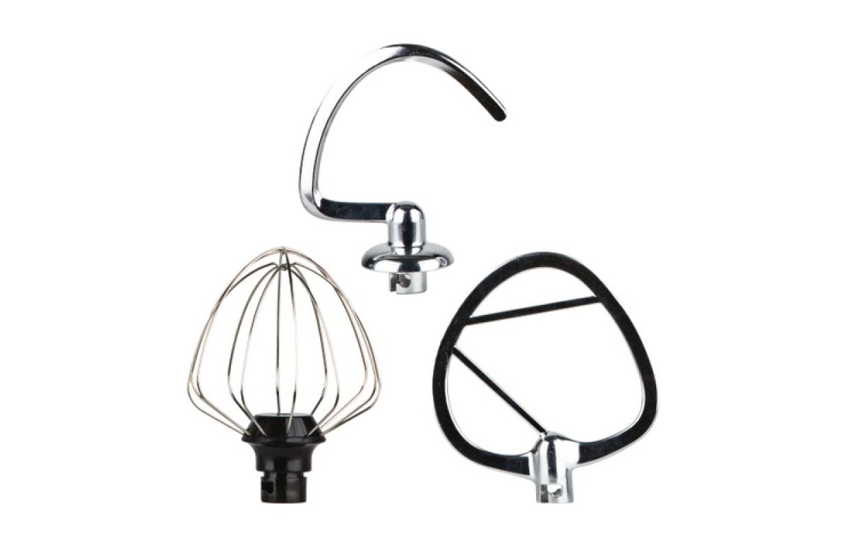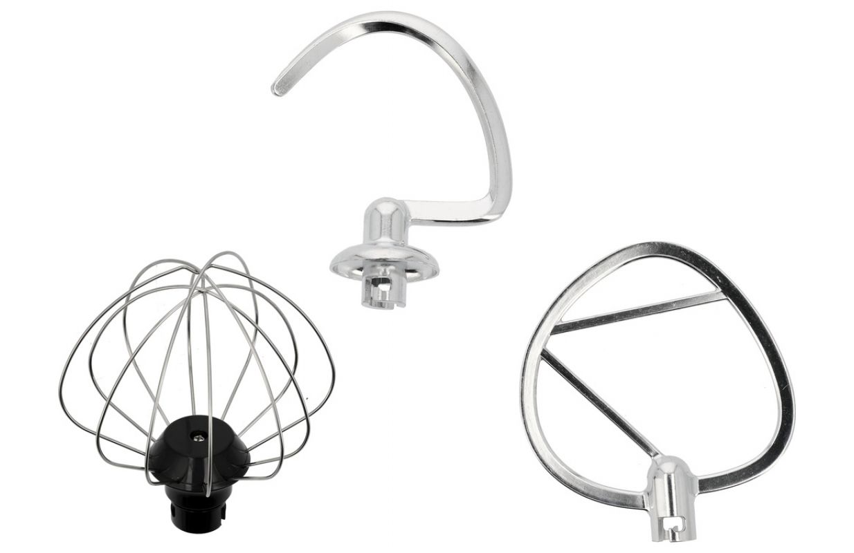 Alumīnija āķis mīklai - paredzēts smagas rauga, maizes un picas mīklas mīcīšanai. Izturīga alumīnija konstrukcija nodrošina efektīvu mīcīšanu bez motora pārslodzes. Ideāli piemērots intensīvai un ilgstošai darbībai. Alumīnija putotājs - Universāls aksesuārs biskvītu, masu, pildījumu un krēmu sajaukšanai. Nodrošina vienmērīgu sastāvdaļu sajaukšanu bez pārmērīgas gaisa piepūšanas. Lieliski piemērots ikdienas virtuves uzdevumiem. Nerūsējošā tērauda putotājs SS 304 - Augstas kvalitātes putotājs olu baltumu, krēma un vieglu krēmu putošanai. Nerūsējošais tērauds SUS304 ir izturīgs pret koroziju un drošs pārtikai. Garantē lielisku aerāciju un gaisīgu konsistenci. Trauks no nerūsējošā tērauda 4L SS 304* – Plašs, kontūrveida trauks no augstas kvalitātes nerūsējošā tērauda 304 ir izturīgs pret koroziju un drošs pārtikai. Ideāli piemērots ikdienas lietošanai un viegli tīrāms. Trauka vāks - Aizsargā no sastāvdaļu šļakatām darba laikā. Aprīkots ar atveri sastāvdaļu pievienošanai sajaukšanas laikā un olu dalīšanas funkciju. Palielina komfortu un tīrību virtuvē.