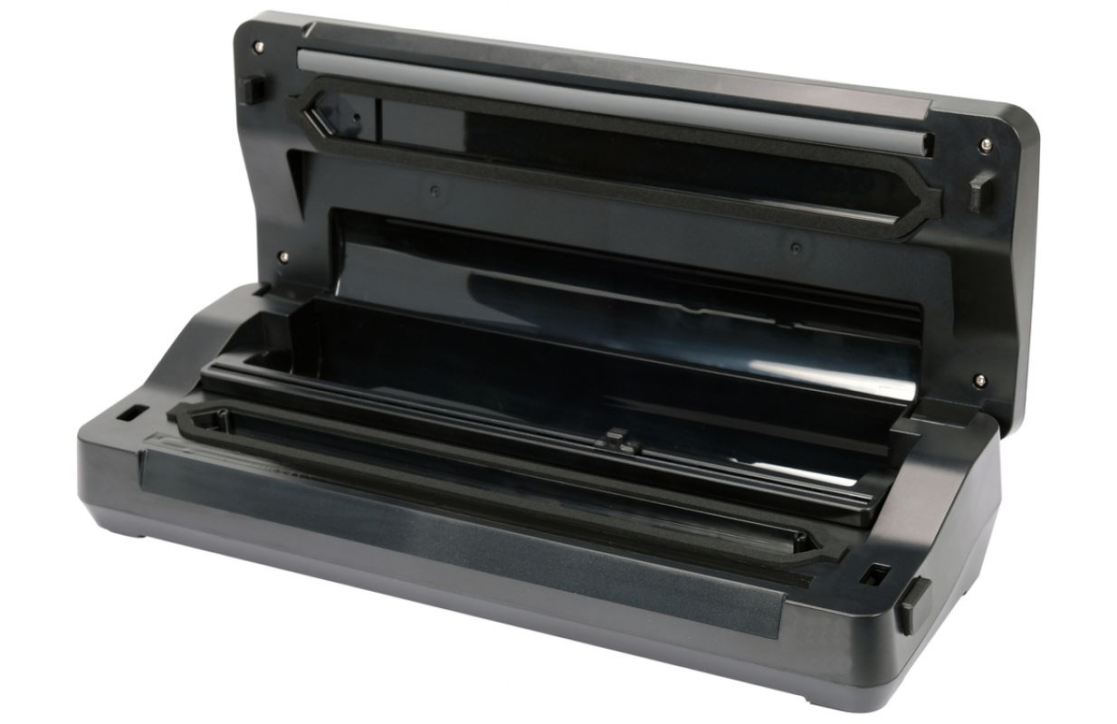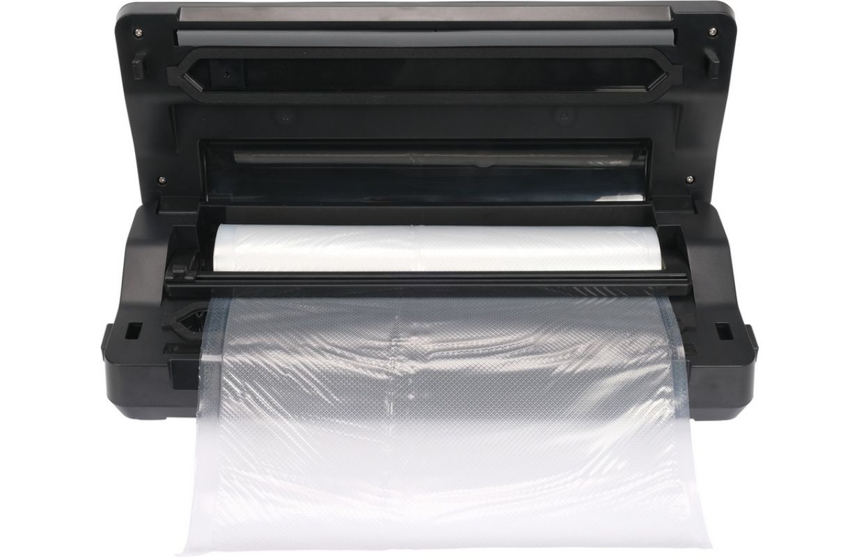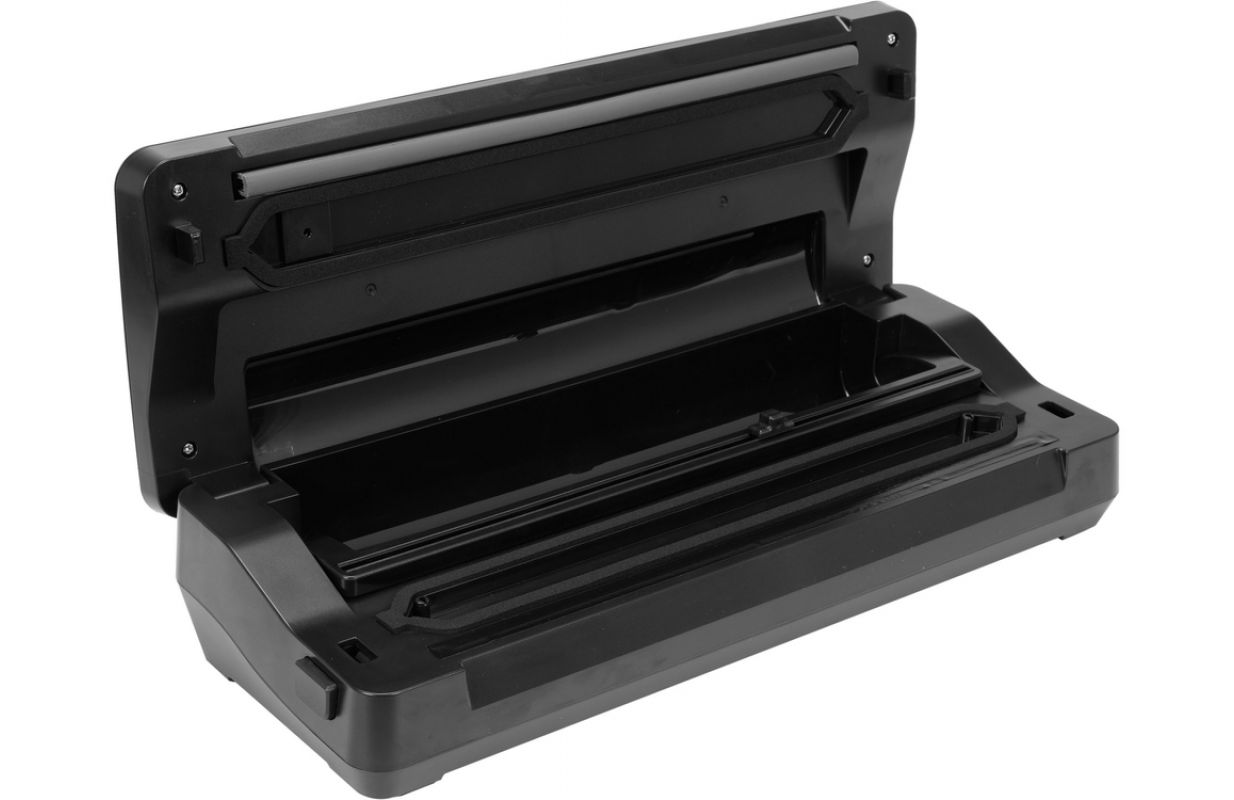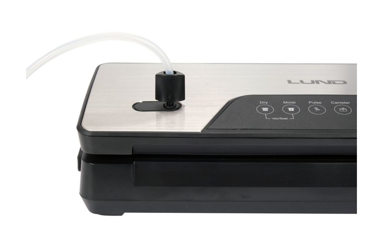 kameras ruļļa mīkstajam iepakojumam (ietilpība atkarīga no ražotāja un ruļļa biezuma). LUND zīmola ruļļi ar garumu 600 cm un maksimālo platumu 28 cm Šļūtene gaisa izņemšanai no vakuma traukiem ir iekļauta. Šļūtene ir universāla, taču ražotājs neuzņemas atbildību par sliktu šļūtenes saderību ar citu zīmolu vakuma traukiem un iepakošanas ierīcēm ass, divpusējs un integrēts vakuma iepakošanas ierīcē plēves griezējs. Tas ir droši nostiprināts, lai neriskētu sagriezt ādu. Tas labi pieguļ vakuma iepakošanas ierīces virsmai, izmantojot 2 magnētus vākam ir bloķēšanas un atbloķēšanas sistēma augšējās un apakšējās blīves garantē gaisa necaurlaidību, izņemot gaisu no sieta maisiņiem augstas kvalitātes sildīšanas jostas blīve un sildīšanas josta korpuss izgatavots no augstas kvalitātes plastmasas un nerūsējošā tērauda 4 pret slīdēšanas kājas produkta izmērs: 39 x 15 x 8.5 cm iespēja atvienot strāvas vadu no ierīces Komplektācija: